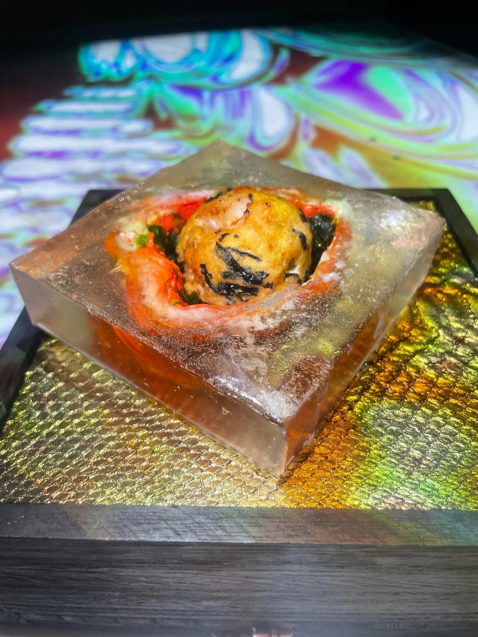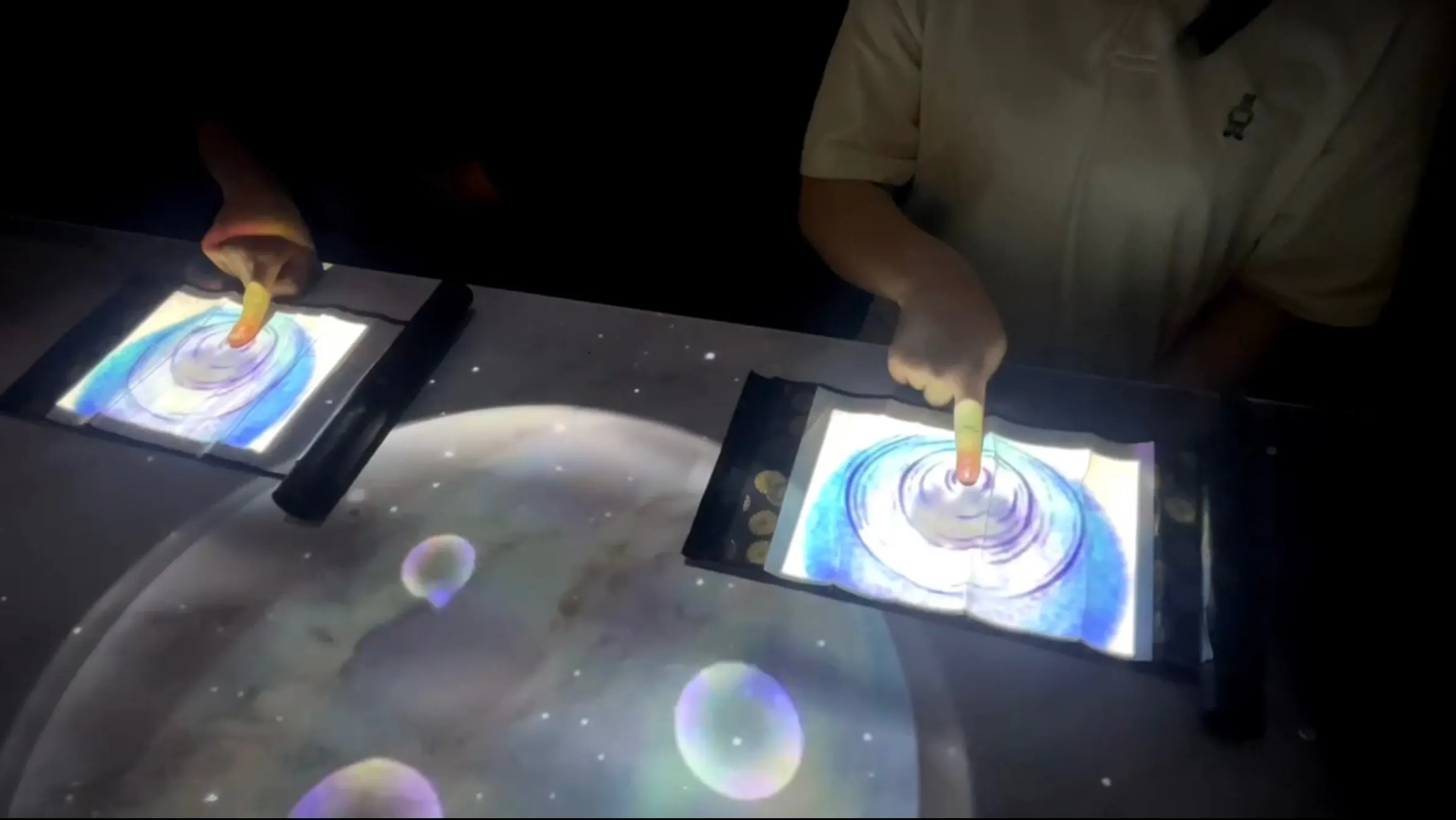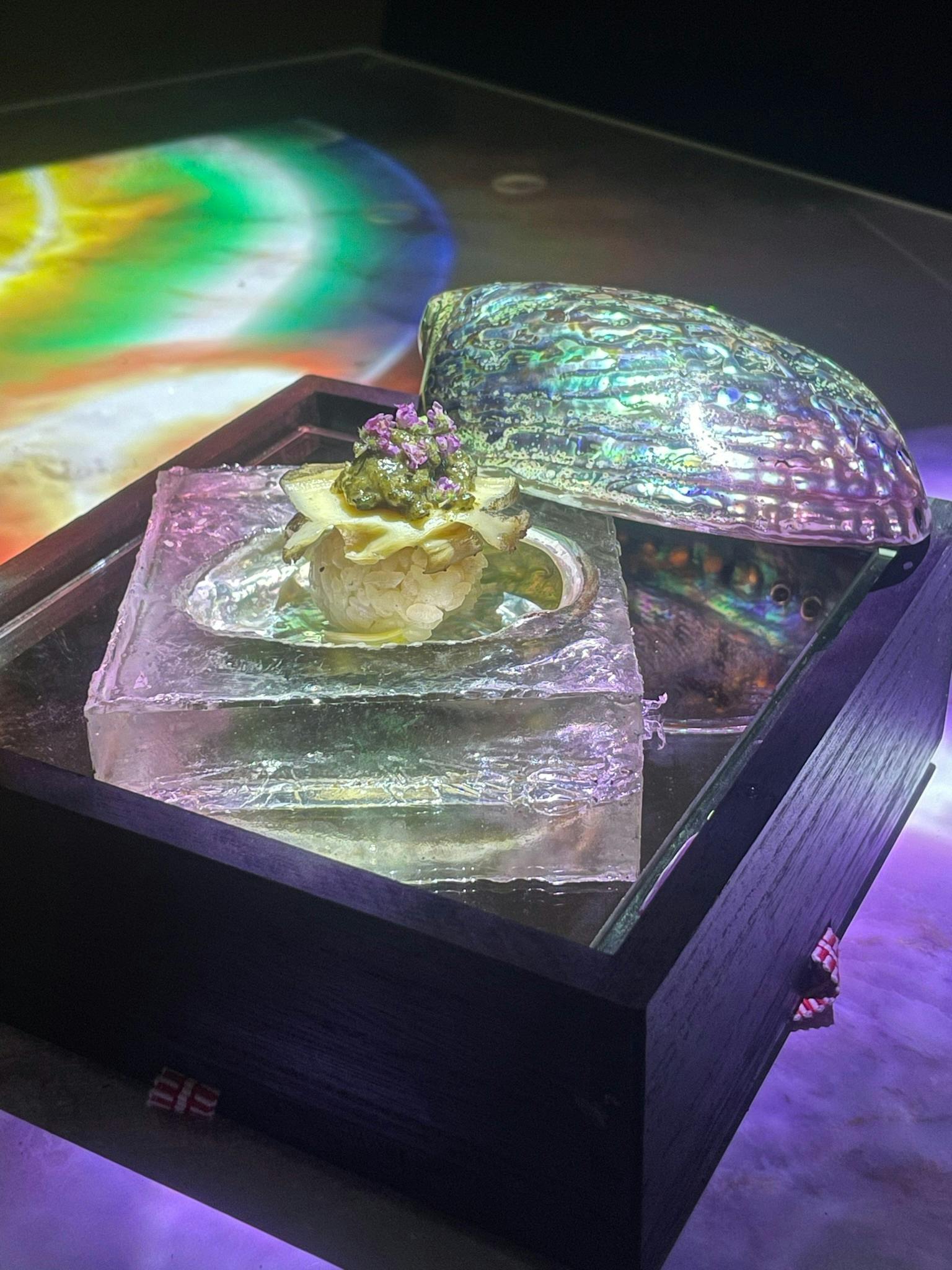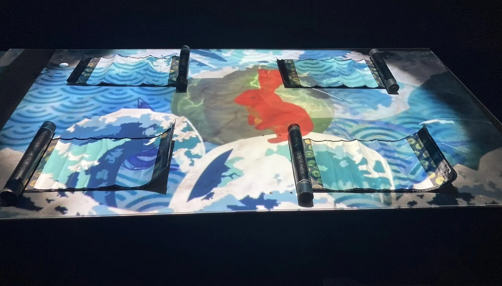 市場で購入した、その日の1番いい魚を使用しております。魚は旬のものを使用しているので、その時によって違う魚をお楽しみいただけます。また、竜宮城にちなんでいる、玉手箱の様な器にもご注目ください。こちらのシーンでは、右の写真のようにお話が映し出される巻物に指を置いていただくことで、お話の中に入り込んだかのような体験をしていただくことができます