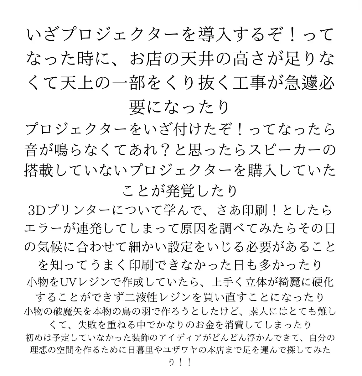 これぜ〜〜んぶ作ったんです……画面に収まらなかったり位置が固定されていたりで映っていないものもまだまだあります……(従業員の方にも手伝っていただきながら作成しました)