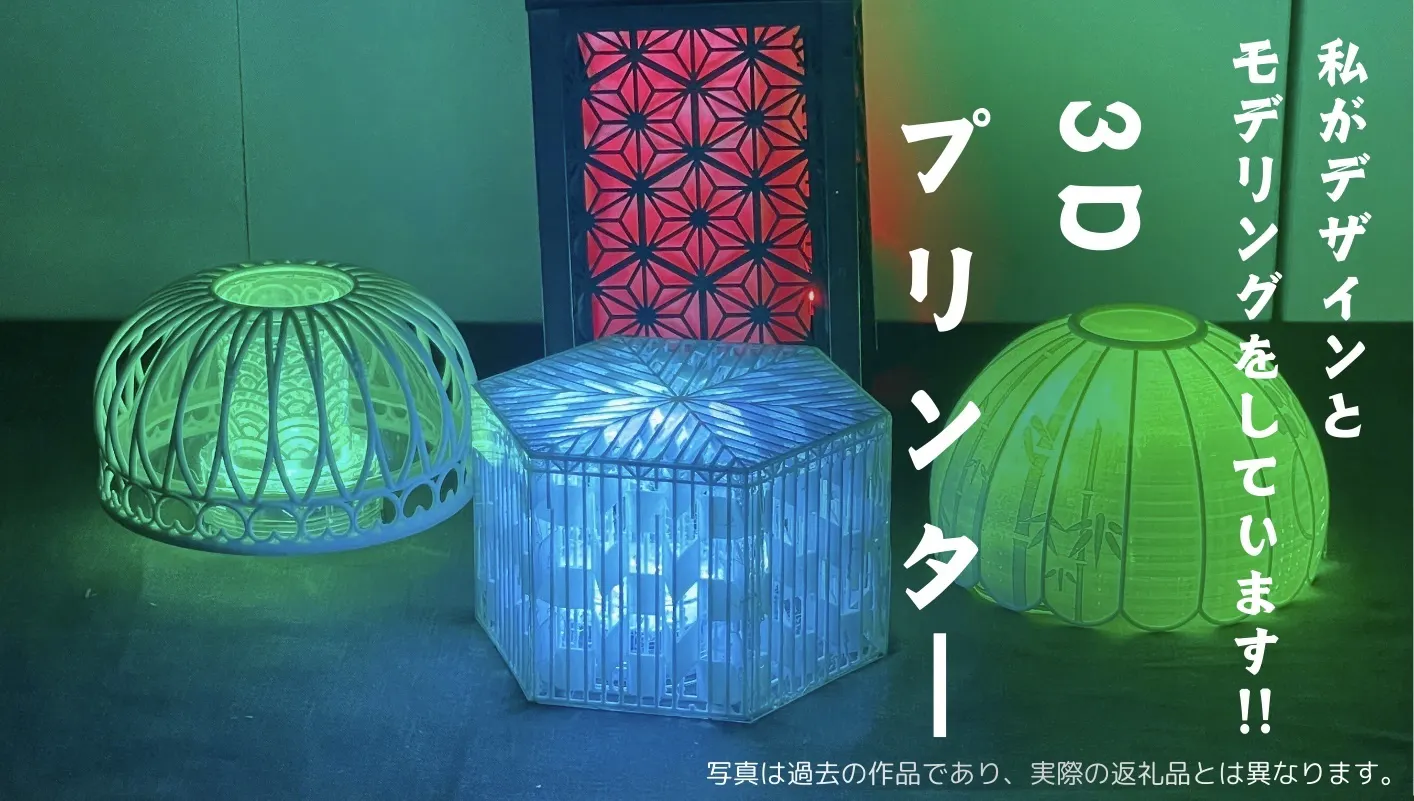 今でもものづくりは好きで、一昨年からは3Dプリンターにも挑戦し始め、コース料理の小物にも3Dプリンターで自作したものも一部使用していたりもします。そんな、「新しい技術」としてこのコース料理を支えている3Dプリンターを、間接照明のインテリアとして返礼品で贈ることにしました。