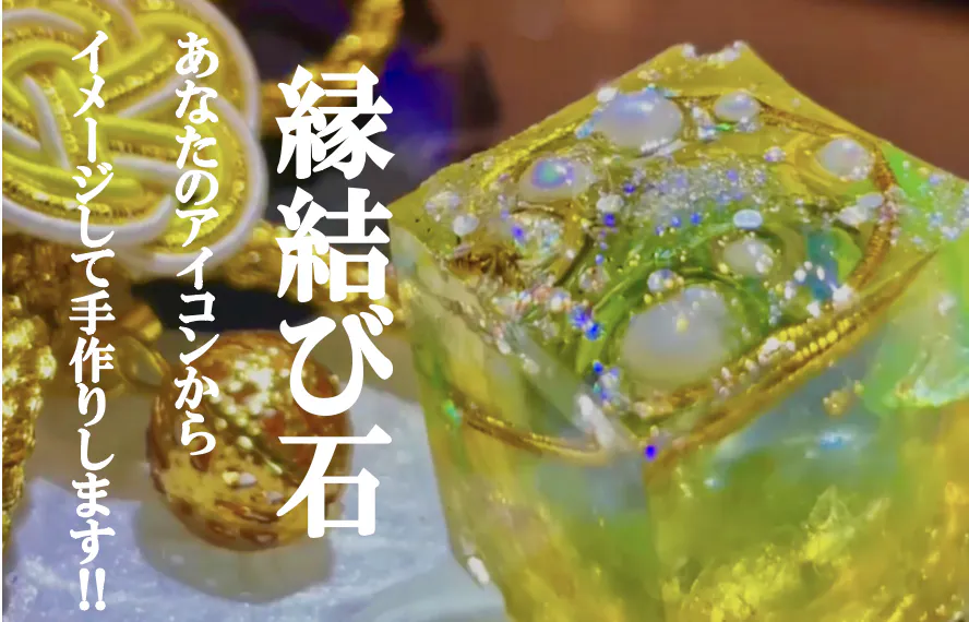 この縁結び石は、プロジェクションマッピング「神々のおもてなしのコース」のお話の中で登場する、神様から頂く贈り物の組み合わせで作られるあなただけの縁結び石です。今回、縁結び石はクラウドファンディングをご支援頂きましたご縁とその感謝気持ち(意志)を結び石(レジンアート)の形にしました。お守りをモチーフにした袋に入れてしておどけいたします。レジンを使い、手作りで心を込めて特別な一つをおつくりします。