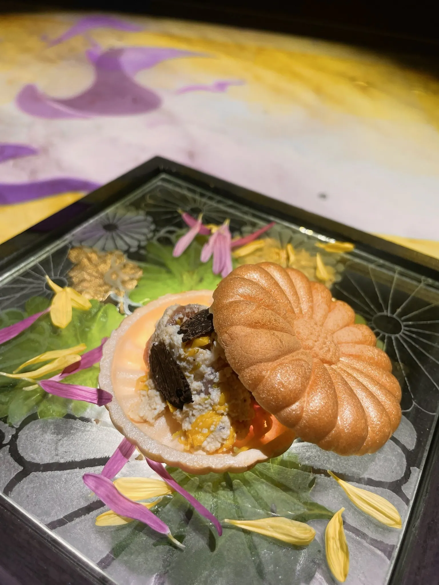 菊理媛神は、縁結びの神様としても知られている神様です。お料理やマッピングでは菊理媛神の菊にちなんで様々な場面で菊が活躍しています。菊花最中の餡には、豆腐の白和にトリュフのペースト、燻製にして塩麹に漬けた自家製の生ハムを合わせ、奥深さを演出しております。