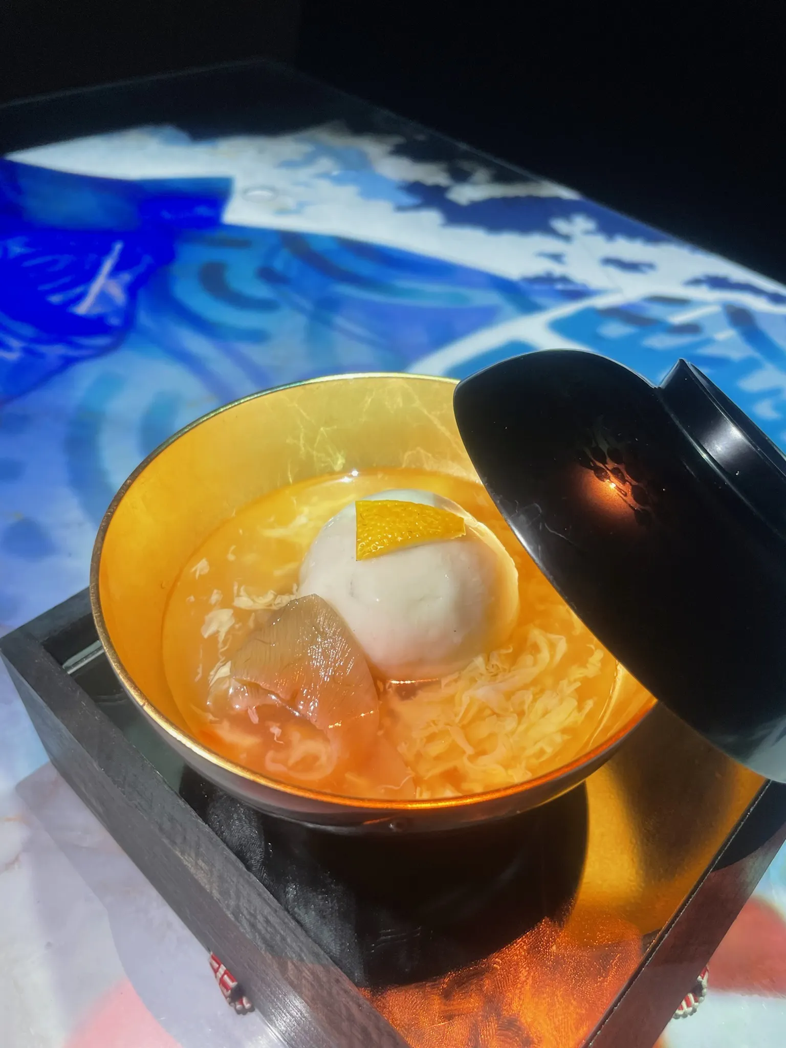 因幡の白兎、皆様ご存じでしょうか。このお話は、因幡の白兎が対岸に渡るためにサメのことを騙して、怒らせてしまったところから始まります。お料理では、サメとフカヒレにみたてて、白くて丸い百合根饅頭とフカヒレを使用しております。また、金色の丸いお椀でうさぎが目指していた月を表現しました。