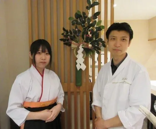 また、制服にも願いと意味を込めています。通常の懐石料理店のスタッフは、着物を着用されている方が多いと思います。瑞亭でも着物を着用していますが、ただの着物ではありません。漆黒の袴に美しい帯が着物を彩るモダンな着物を着用しております。また、帯留めには透明な樹脂で固められた飾りが施されており、スタッフ自身にも縁起の良いおもてなしの意味が込められています。
