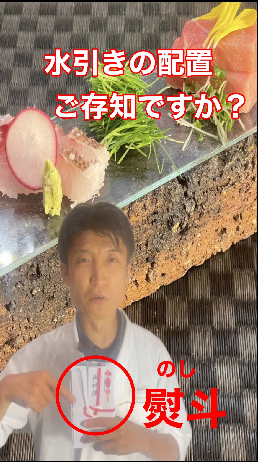 そこでお祝い事の食事には、素材の色などで(お造り、マグロとたい)赤と白があった場合。この配置で盛られることが基本です。