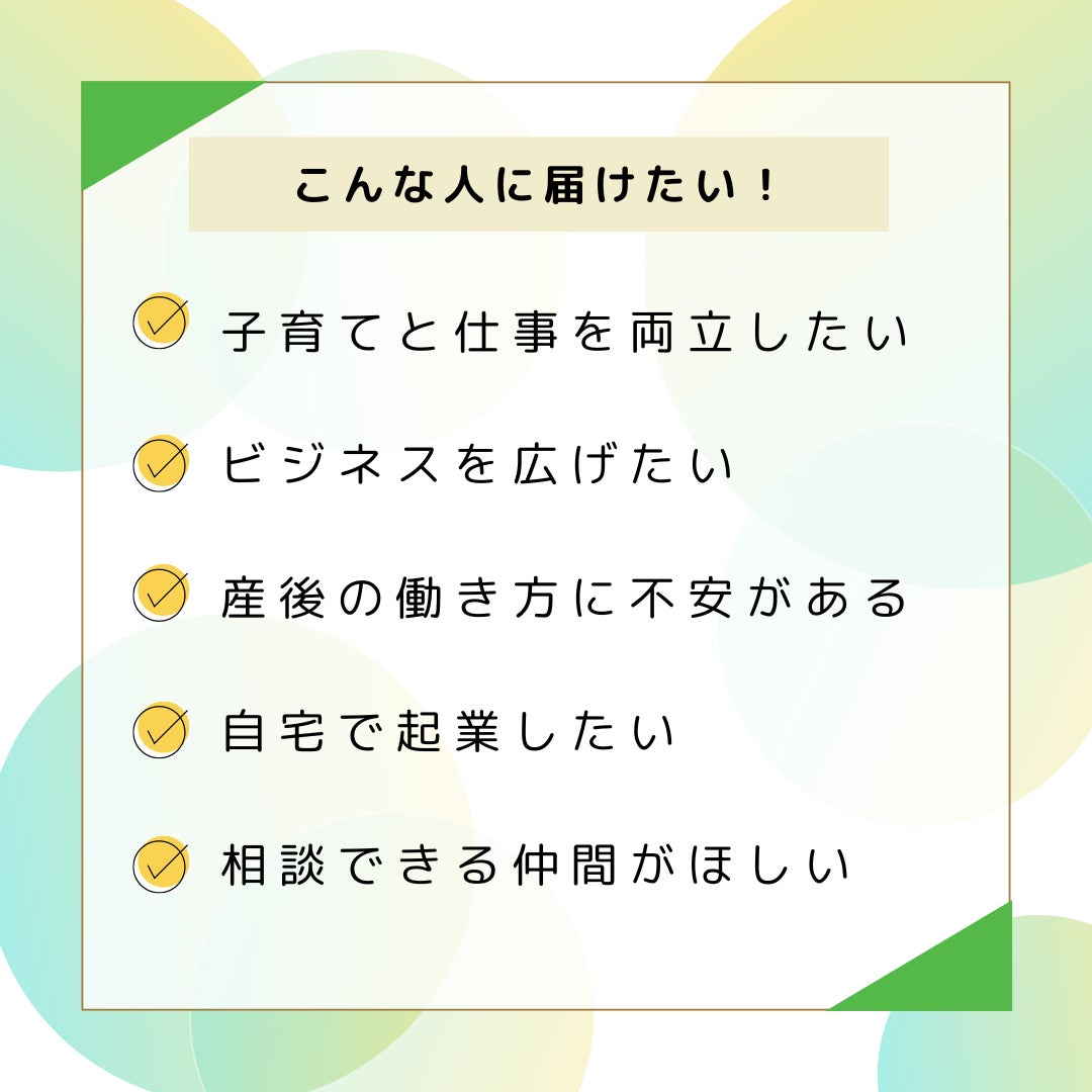特に、小さな子どもがいるママたちは、仕事を続けることが難しいことが多く、家でできるビジネスや副業を行っている方も少なくありません。こうしたパパ・ママたちの活動を応援し、彼らのビジネスが社会貢献に繋がる形を作ってきます。