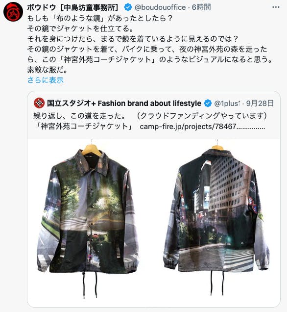2024/10/06 18:38あまりにも素敵なお言葉なので、ここにリピートさせていただきます。もしも「布のような鏡」があったとしたら? その鏡でジャケットを仕立てる。 それを身につけたら、まるで鏡を着ているように見えるのでは? その鏡のジャケットを着て、バイクに乗って、夜の神宮外苑の森を走ったら、この「神宮外苑コーチジャケット」のようなビジュアルになると思う。 素敵な服だ。ありがとうございます。リンクX もっと見る