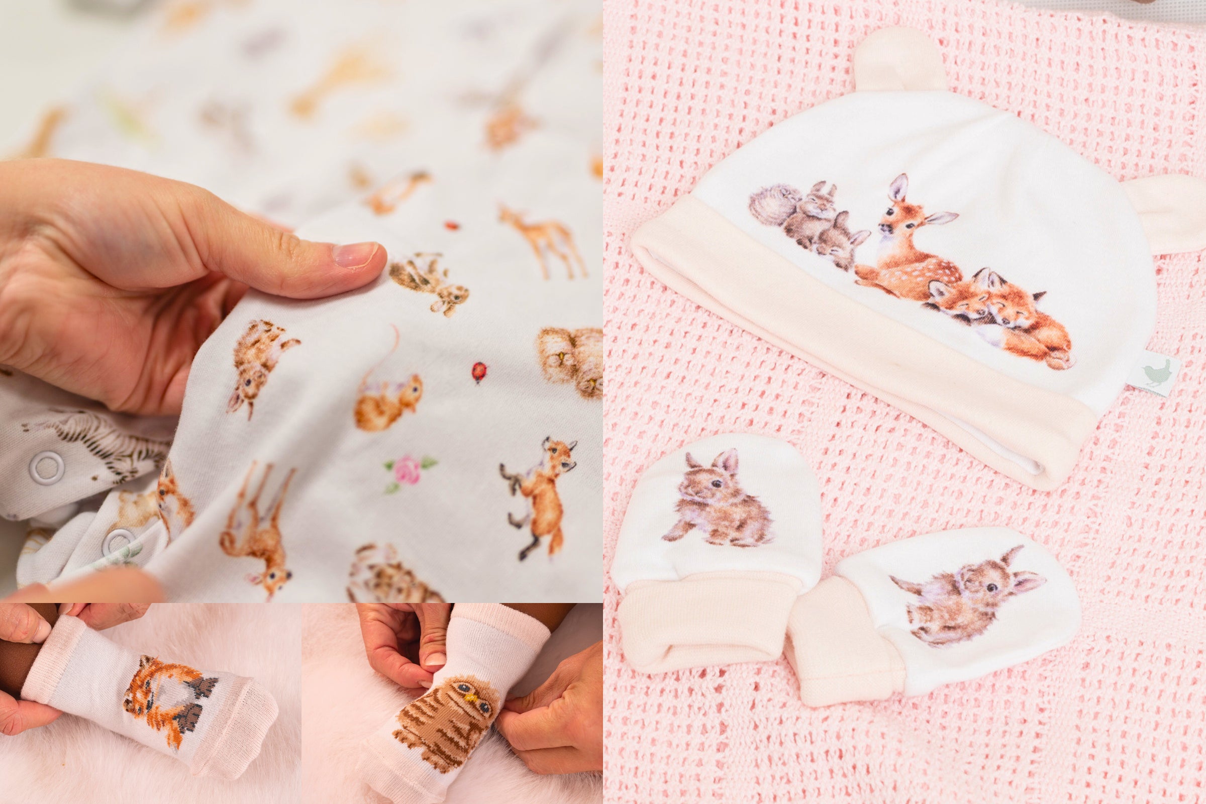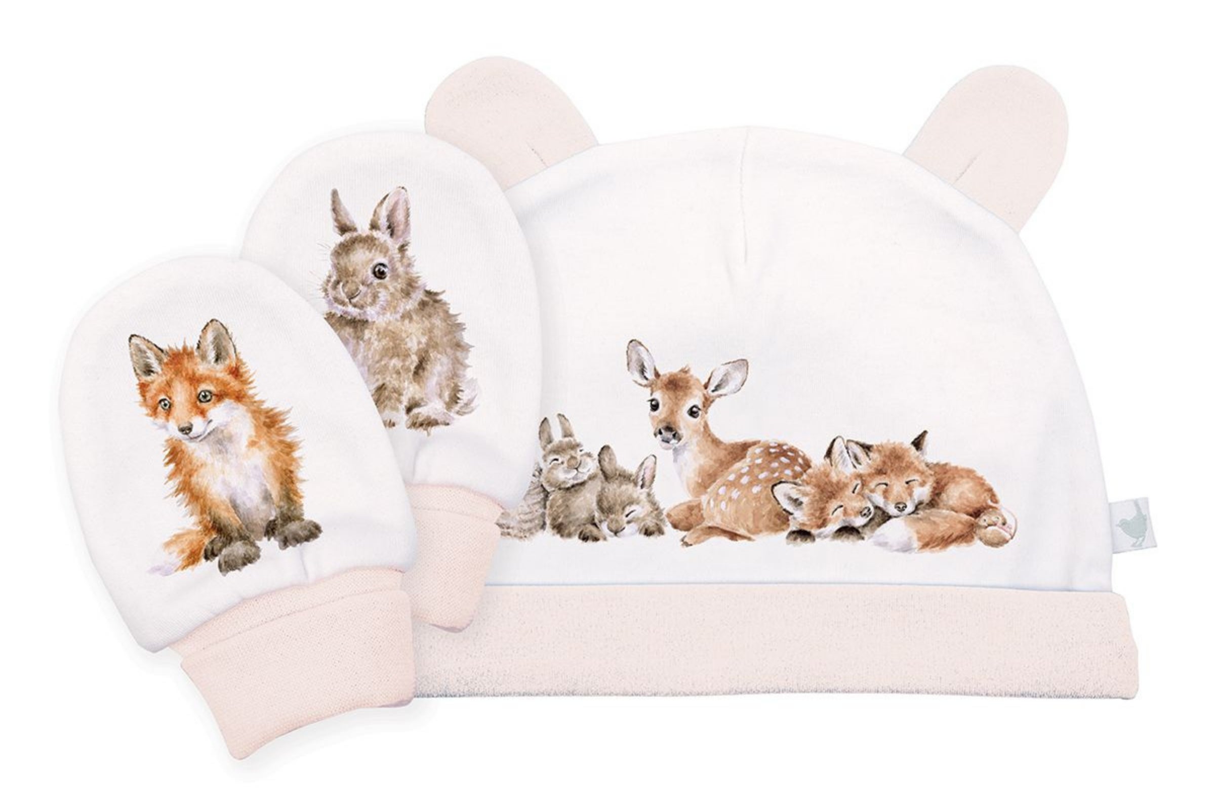 「森の赤ちゃん柄」がデザインされた暖かい帽子と、赤ちゃんの手をやさしく包むミトンのセットです。ロンパースやブランケットとお揃いの柄がとても可愛く、愛らしい耳が特徴の帽子で可愛く着飾ってみませんか?