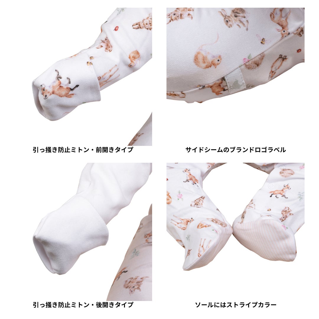 ロンパースに腕に取り付けられたミトンは、赤ちゃんが自分の爪で顔をひっかくのを防ぎ、バンザイ寝の際に手指の防寒もしてくれます。サイドシームには『リトル・レン』のブランドロゴの織りラベル、足の裏にはさりげなくストライプカラーの切り返しパターンなど、レンデールの「細部へのこだわりと品質」で作られています。