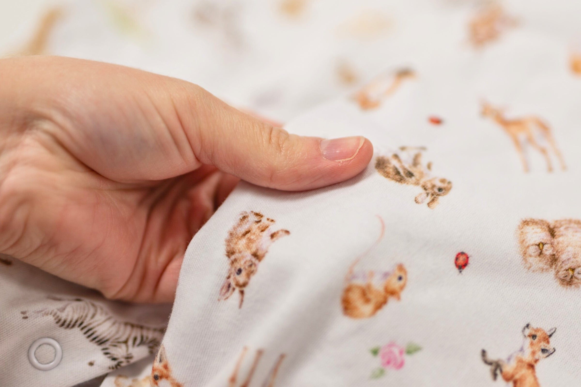 ◆ ソフトなパステルピンク生地に可愛いシカ、キツネ、ウサギ、フクロウ、ネズミの赤ちゃんがデザインされています。