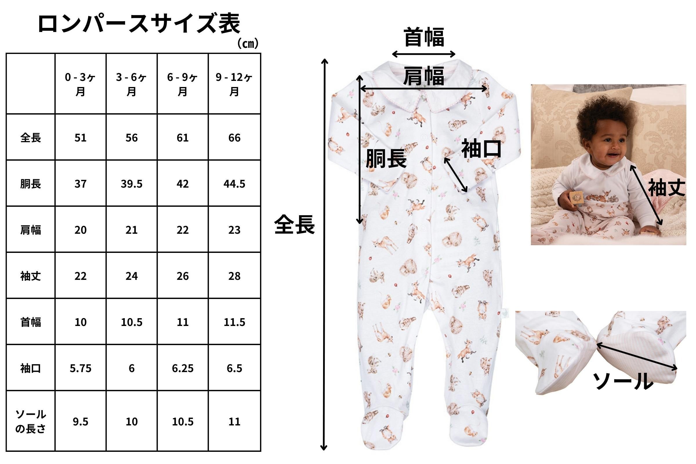 可愛らしい刺繍入りのピーターパンカラーや、ブランドロゴのイラスト入りスナップボタンなど、細部までこだわったデザインですので、赤ちゃんへの特別な贈り物として最適です。
