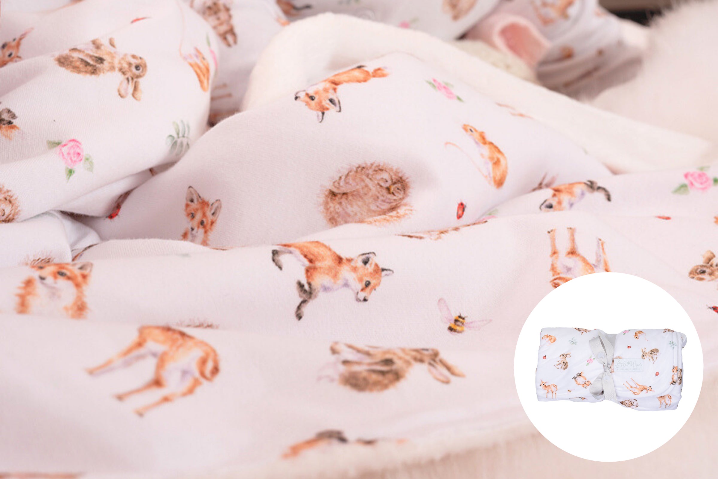ブランケットの表面は白地の柔らかなコットンに可愛いシカ、キツネ、ウサギ、フクロウ、ネズミの赤ちゃんの総柄がデザインされており、お部屋のアクセントとしても素敵な商品です。