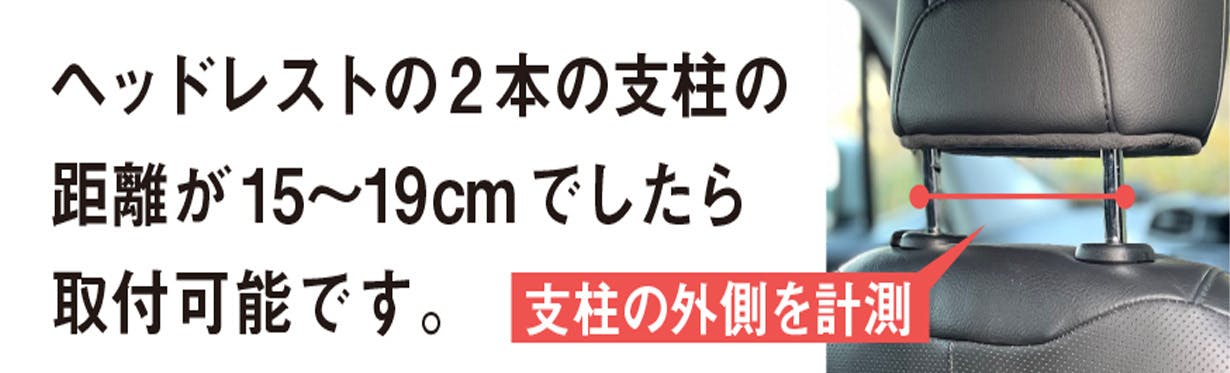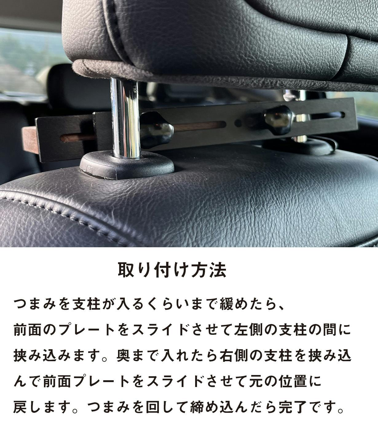 メーカー、車種によりヘッドレストを支えている2本の支柱の間隔が違いますが無段階に対応できるアタッチメントにより、ほぼ全ての車種に取り付け可能です。まずはヘッドレストのサイズを計測して規定の範囲以内かご確認ください。取り付けは2枚のプレートで挟んでつまみを回して締め込みます。