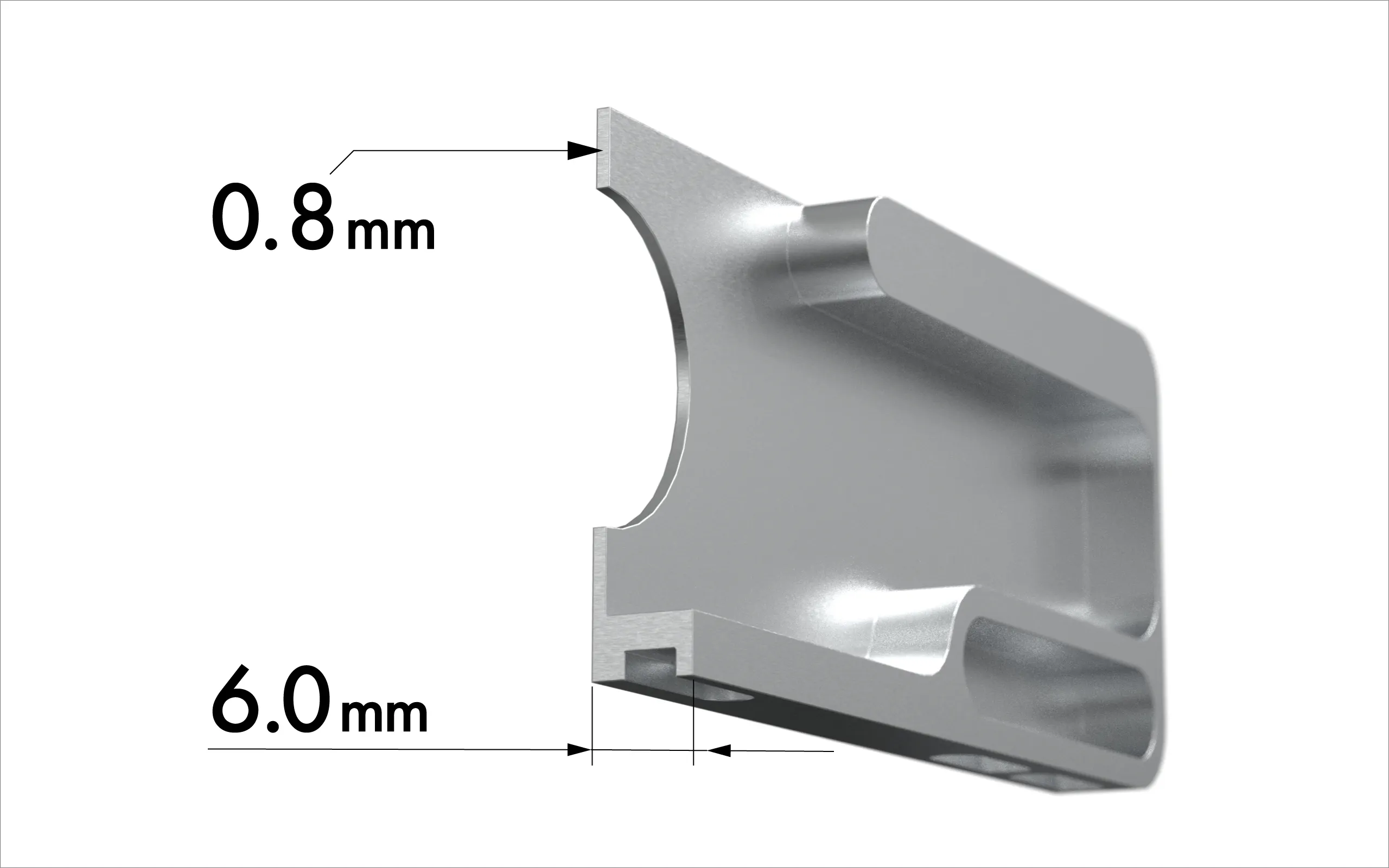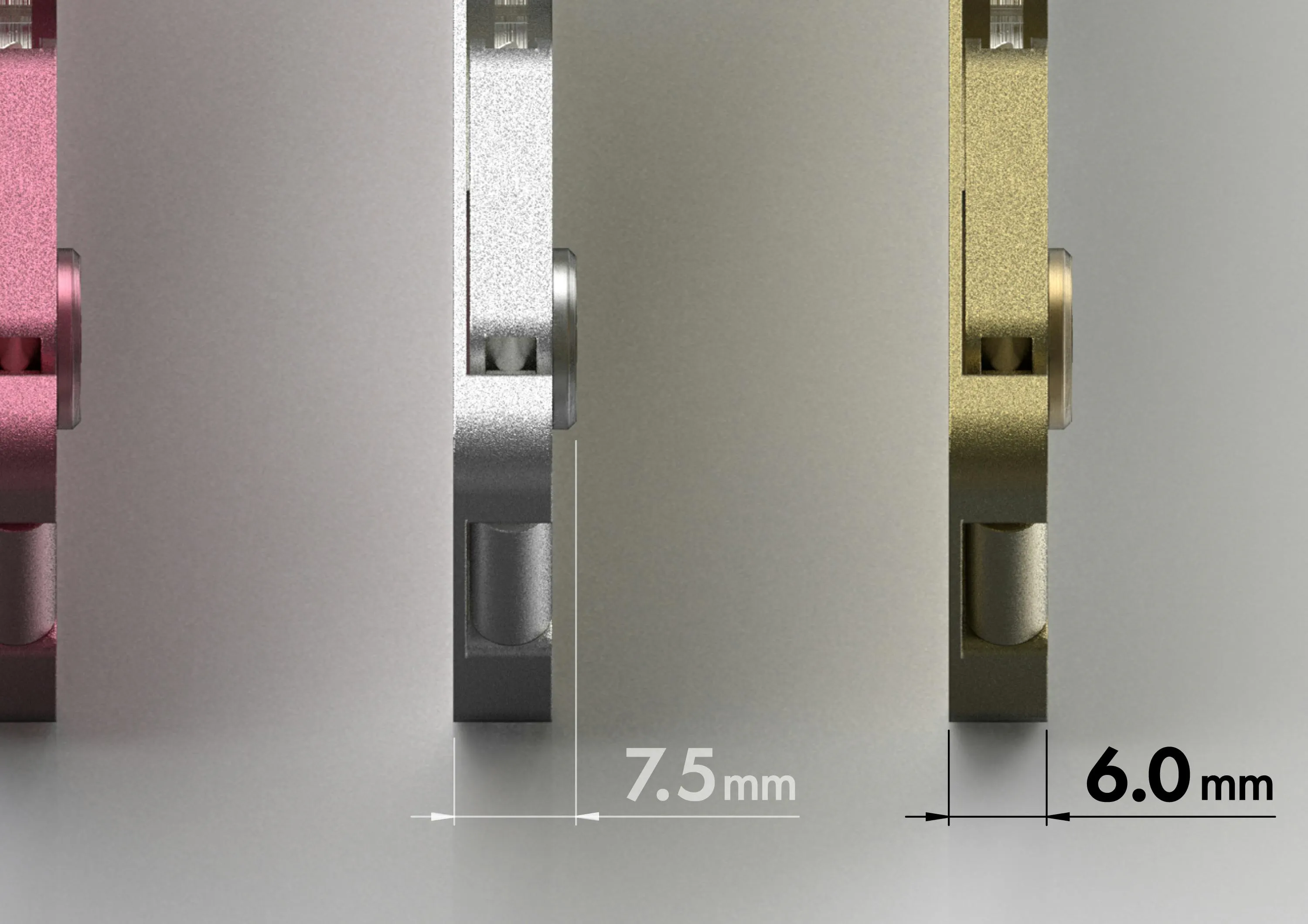 フレームの厚みは6mm。そして最薄部分は僅か0.8mmです。強靭なアルミ素材と、高度な金属加工技術だからこそ可能になりました。もちろん、単に薄くすることを目指すのではなく、大切な鍵を確実に守れる強度を確保しつつ、極限までの薄さを追求しています。