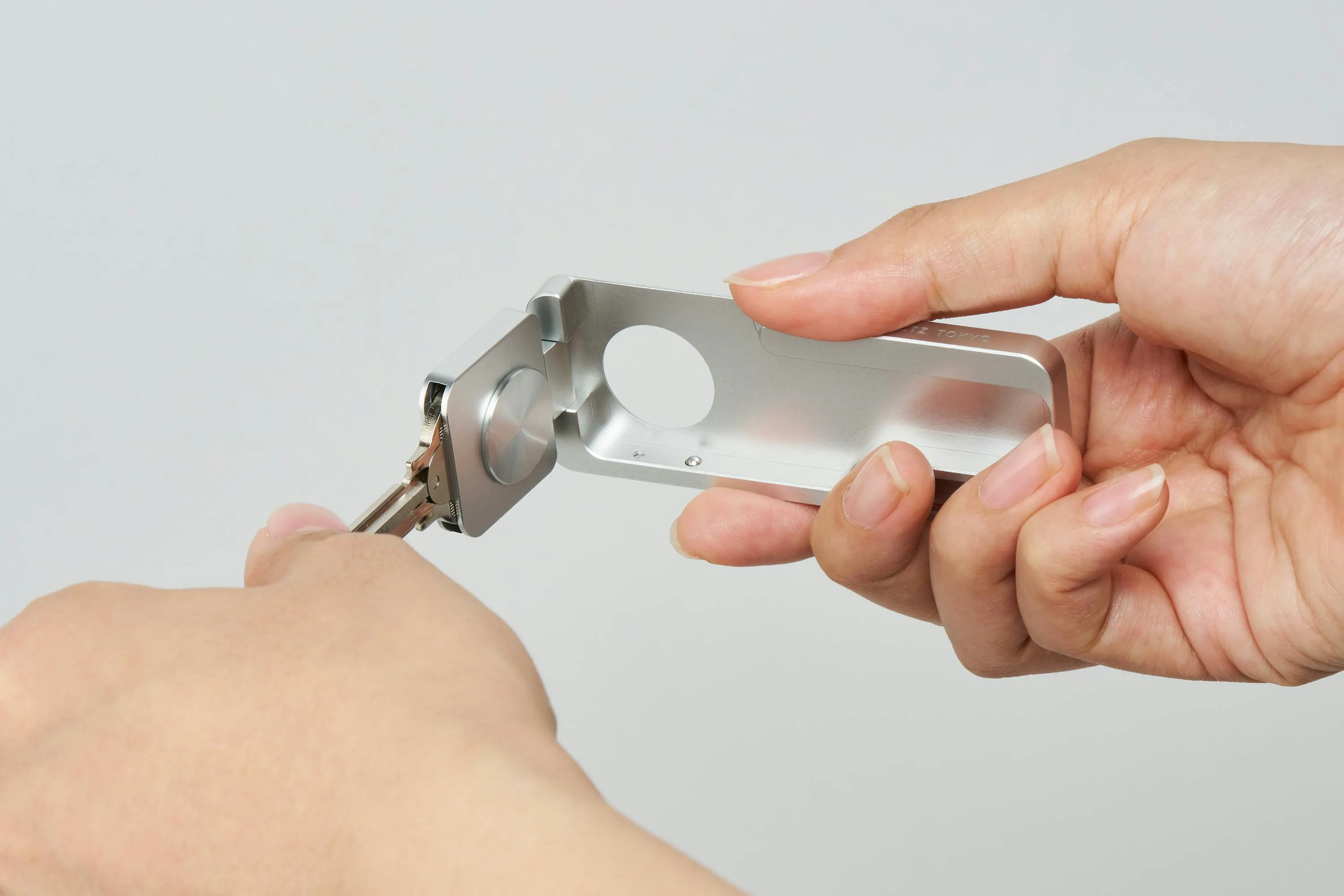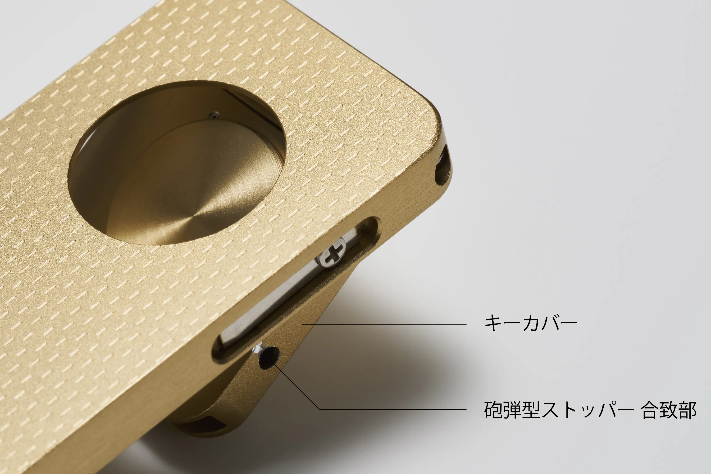 キーカバーの本体フレームへの脱着は「砲弾型ストッパー」によって行われる構造です。鍵を取出したり戻したりする際の「カチッ」とロックされる感触も、精密な金属加工ならではの心地よさです。※ 特許(第6797446号)