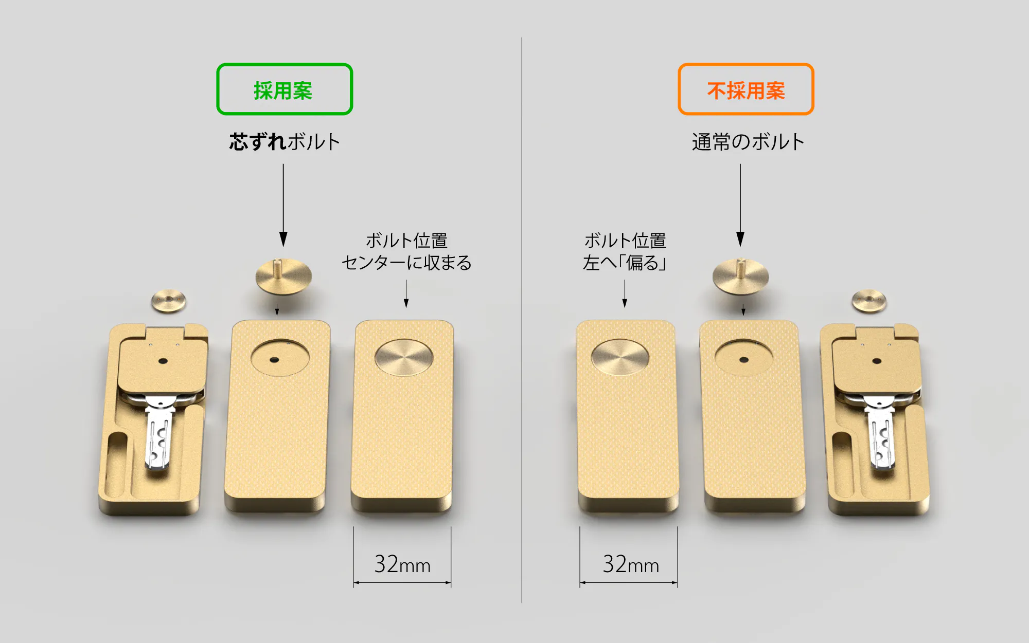 構造的に最小限のケース幅(32ミリ)の中で、ボルトをセンターに配置し違和感の無いデザインに仕上げています。