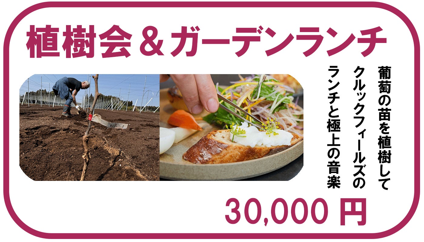 支援者様に一本一本ブドウの樹を植樹していただき、その後畑でささやかな食事会を開催させていただく予定です。当日のガーデンランチは木更津で循環型のくらしを体験できる「KURUKKU FILEDS」が提供。千葉県内の食材などを使い、サステナブルで美味しいランチを楽しみながら、千葉県出身のバイオリニストとギターのデュオ「mille baisers(ミルベゼ)」によるライブもお楽しみいただけます。
