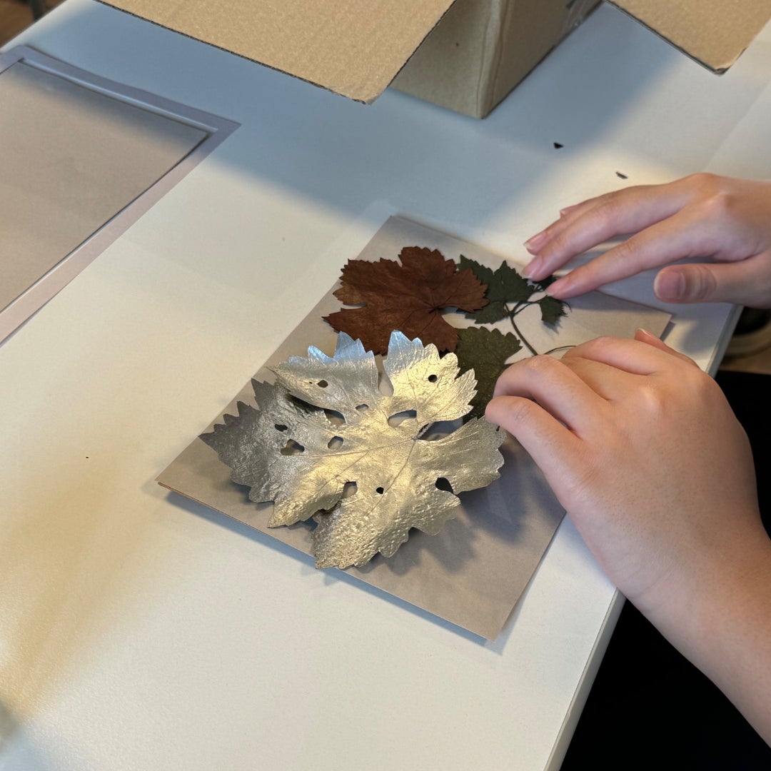 大きい葉っぱや小さい葉っぱ、虫食いの葉っぱなど、「形が全部違ってかわいい!」などと話しながら、このカードを手に取ってくれる方を想像しながら作った作品は、同じものが一つもない「世界でひとつだけの押し葉カード」になりました。