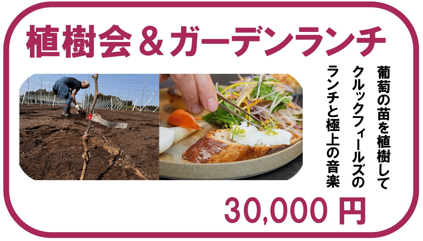 支援者様に一本一本ブドウの樹を植樹していただき、その後畑でささやかな食事会を開催させていただく予定です。当日のガーデンランチは木更津で循環型のくらしを体験できる「KURUKKU FILEDS」が提供。千葉県内の食材などを使い、サステナブルで美味しいランチを楽しみながら、千葉県出身のバイオリニストとギターのデュオ「mille baisers(ミルベゼ)」によるライブもお楽しみいただけます。