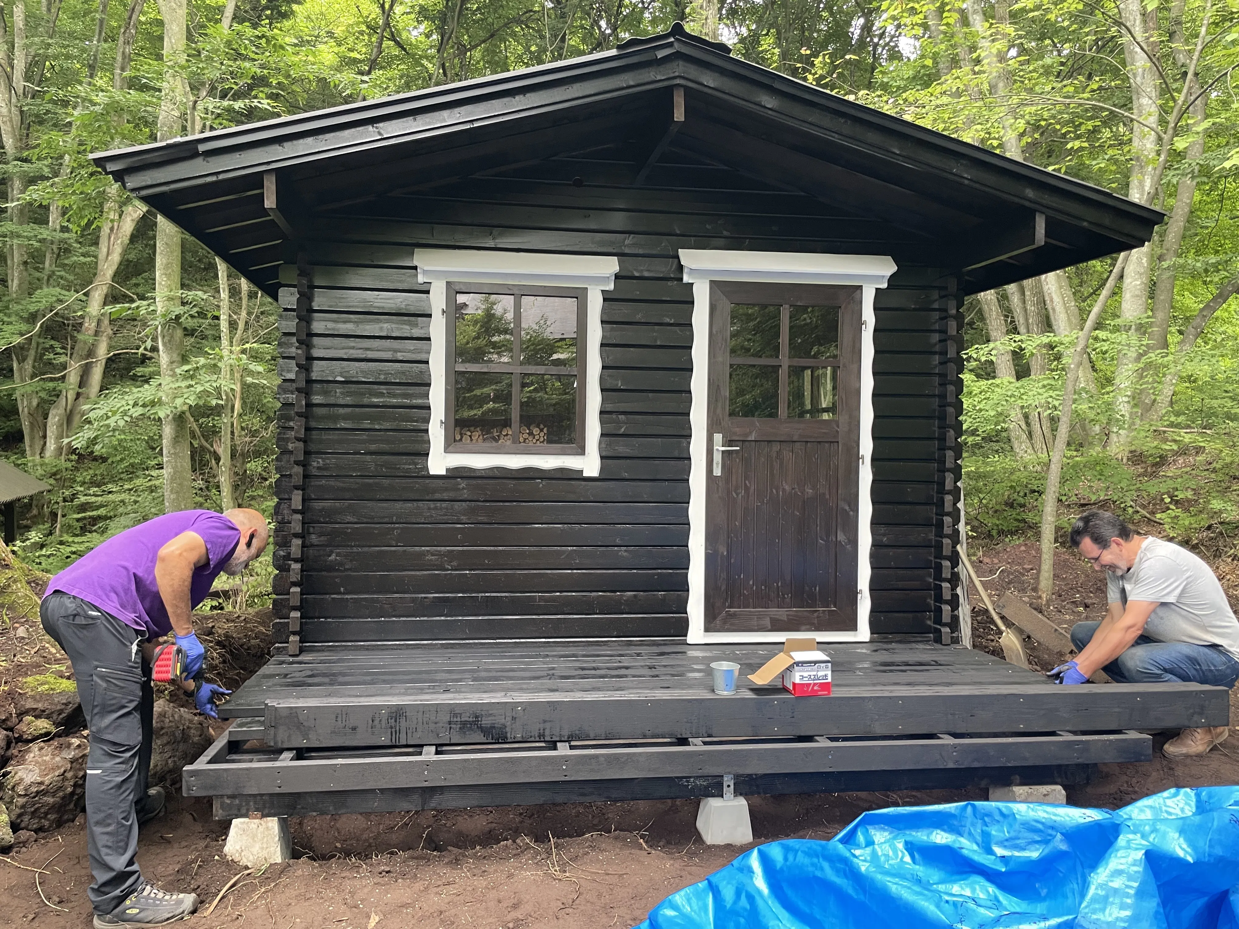 小屋に色を塗り、ウッドデッキ作りの開始しました。