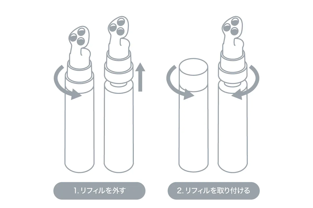 2. 新しく使いたいリフィルのキャップを外し、1で外したマッサージローラーを取り付けます。