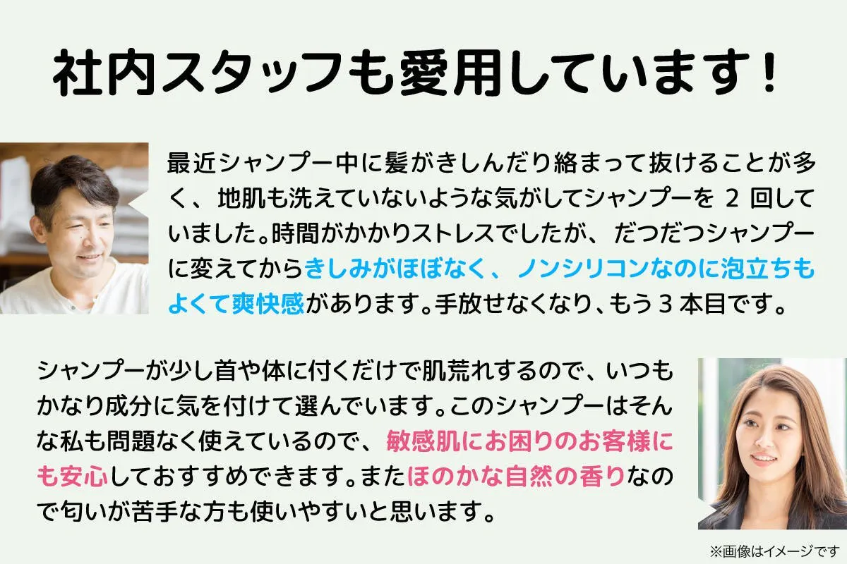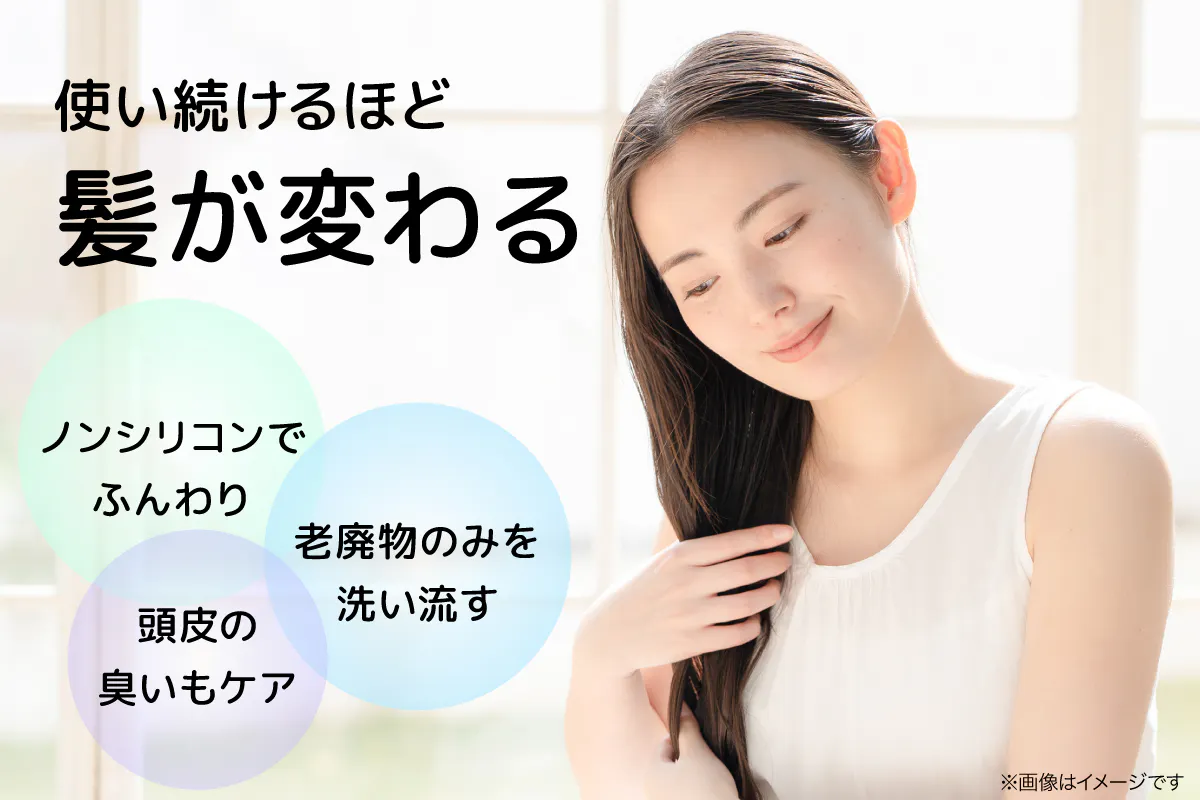 シリコン成分が肌に合わないと、フケやかゆみの原因に。そんなシリコンによる刺激を無くすことですっきりと健康な頭皮へ導きます。