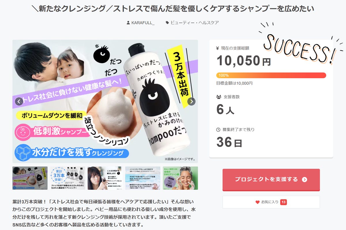2024/09/25 18:00本日9月25日(水)に新たなご支援を頂き、目標金額を達成することができました!ご支援頂いたお客様はもちろん、SNSで投稿を広めてくださったり、様々な方でご協力頂いた皆様のおかげです。本当にありがとうございます。もちろん、もっともっと多くのお客様に「肌に優しいだつだつシャンプー」を知って頂きたいと思っていますので、これからも皆様のご協力がかかせません。頂いているご支援は、さらなる知名度UPのため主に広告費に使わせて頂く予定です。お気に入り登録、SNSでの拡散なども励みになります。最後まで全力で取り組みますので、応援をよろしくお願いします。合同会社KARAFULL スタッフ一同 もっと見る
