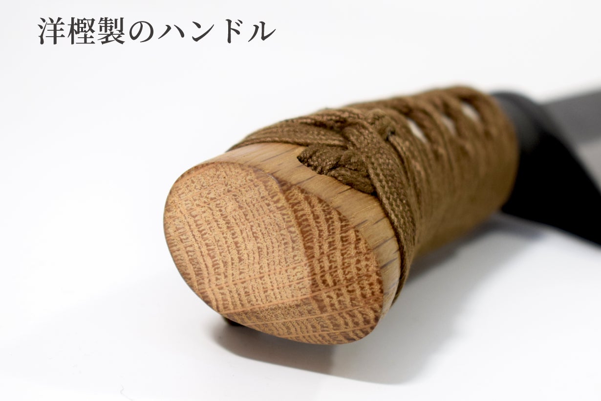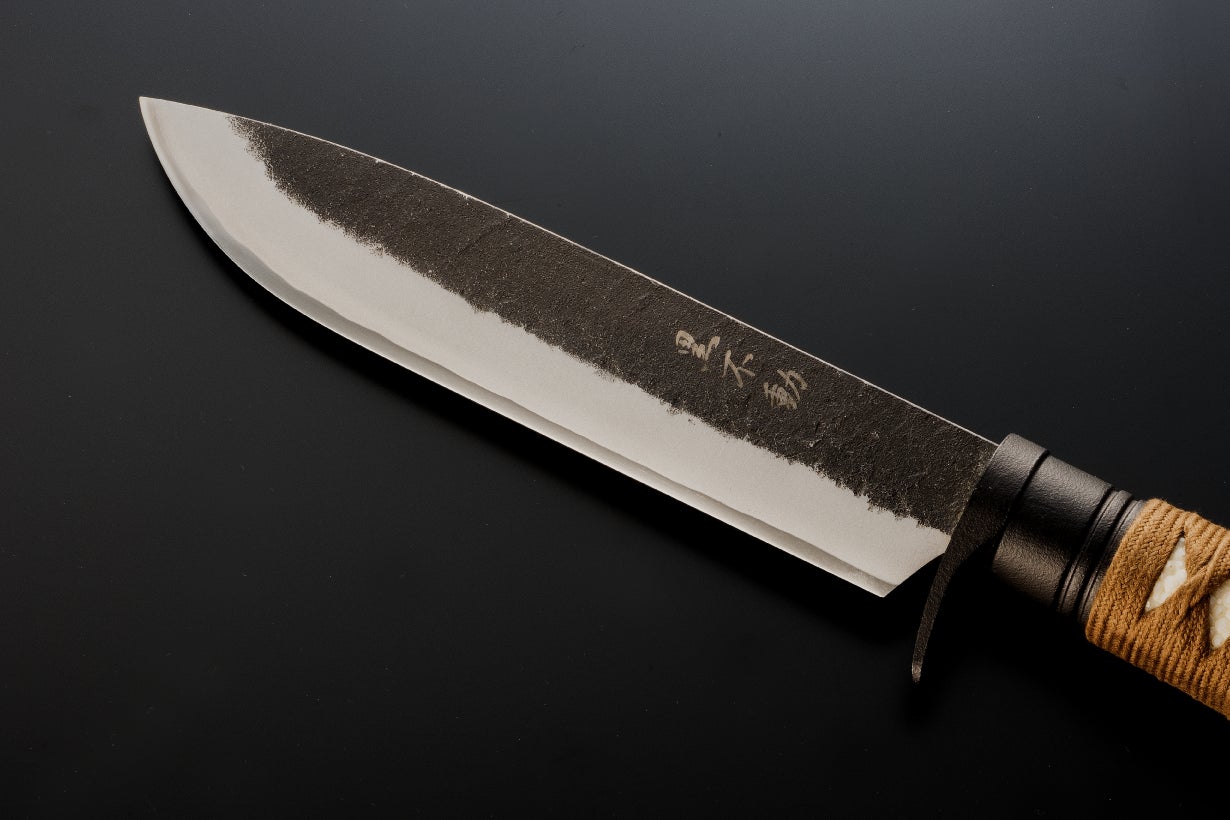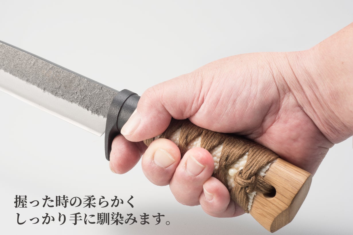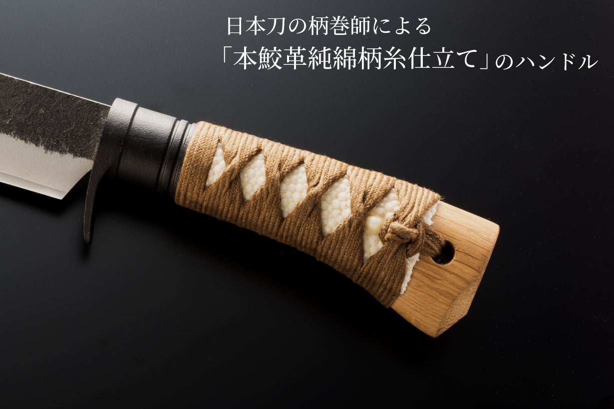 しかし銃刀法で所持が禁止されているのは刃物の「刀身」であって、「柄巻」ではありません。そこで日本刀の柄巻師の職人さんと伝統工芸の土佐打ち刃物の鍛冶屋トヨクニさんの協力を得て、アウトドアでも日本の伝統工芸品の良さが実感できる汎用ナイフを企画しました。