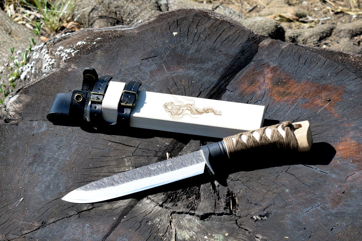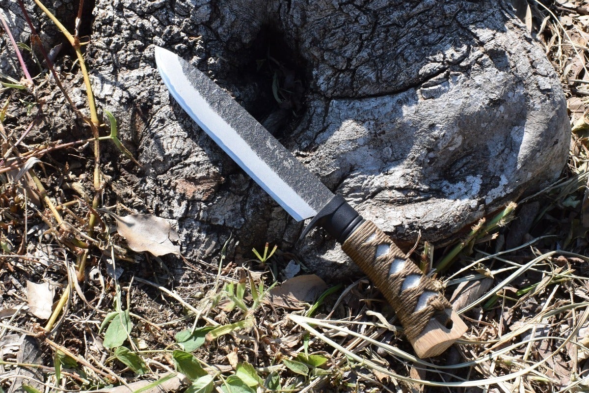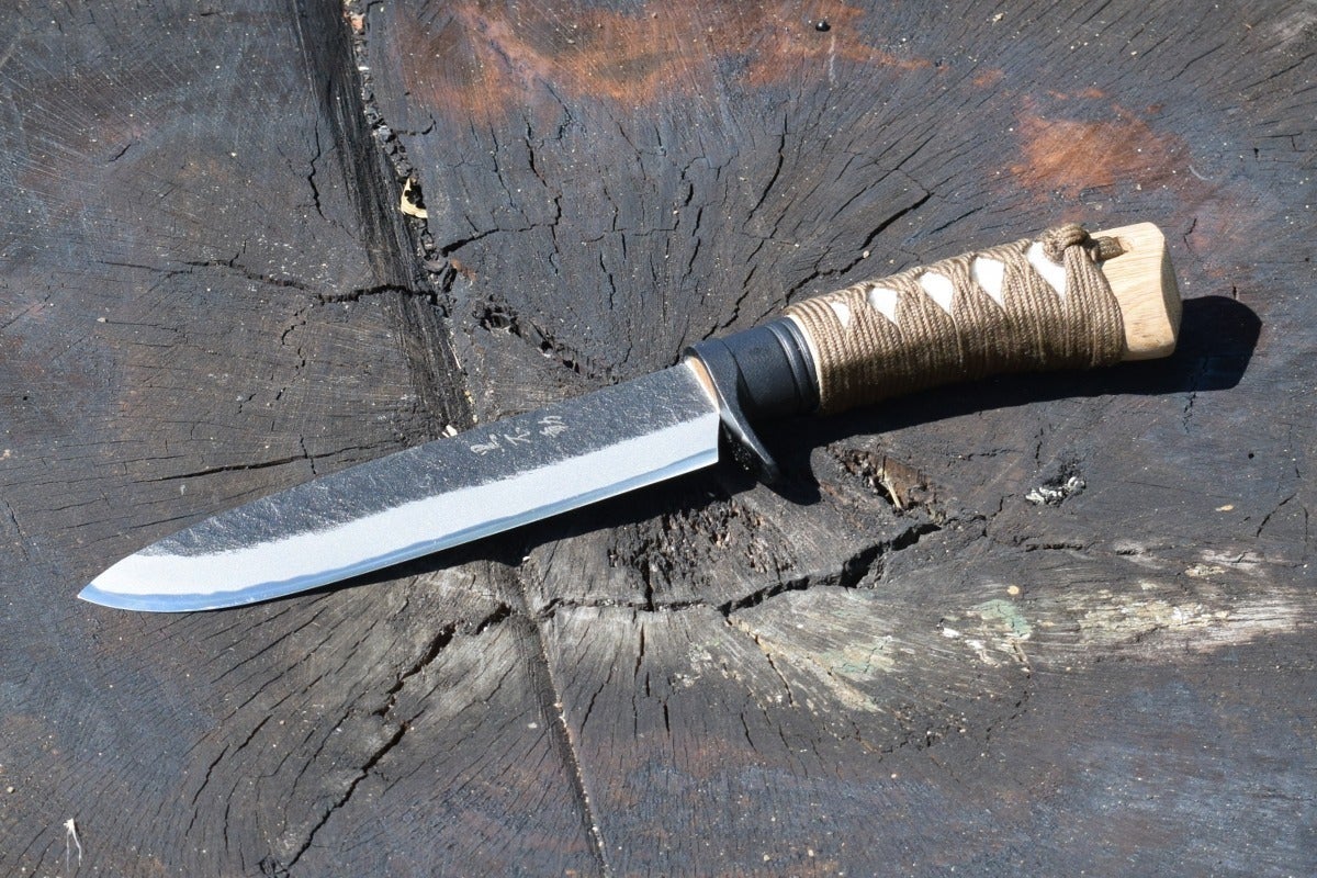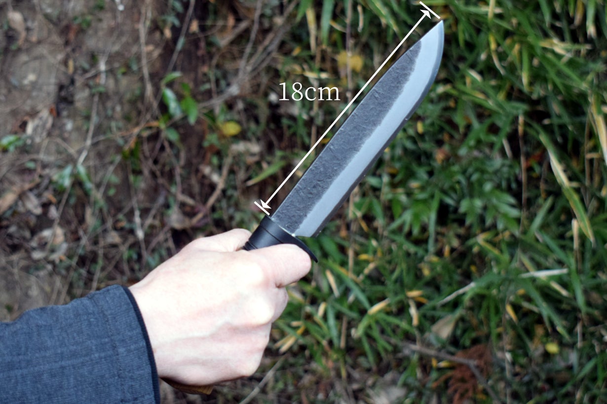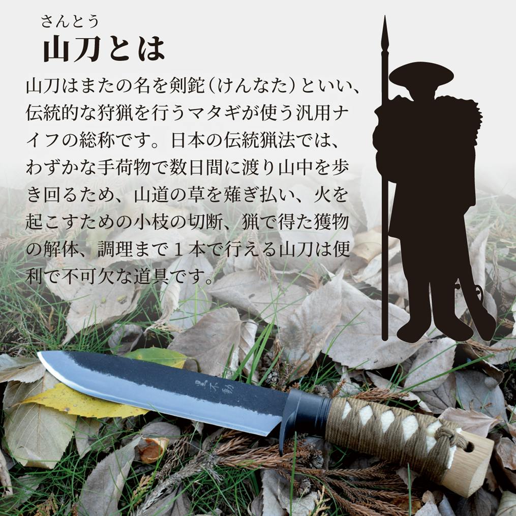 しかし銃刀法で所持が禁止されているのは刃物の「刀身」であって、「柄巻」ではありません。そこで日本刀の柄巻師の職人さんと伝統工芸の土佐打ち刃物の鍛冶屋トヨクニさんの協力を得て、アウトドアでも日本の伝統工芸品の良さが実感できる汎用ナイフを企画しました。