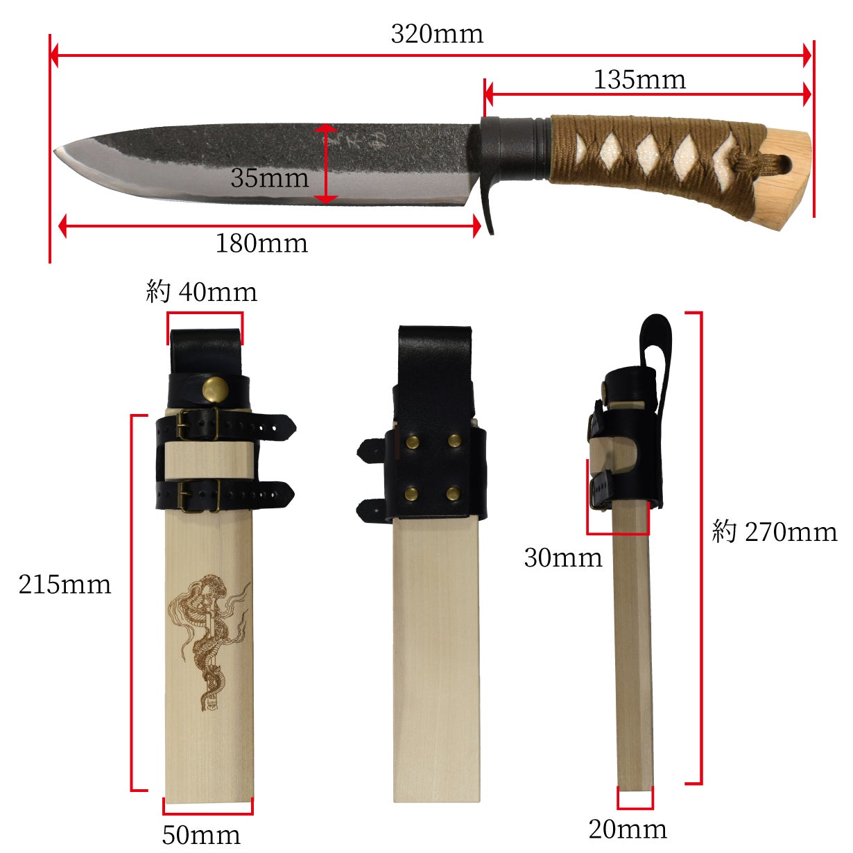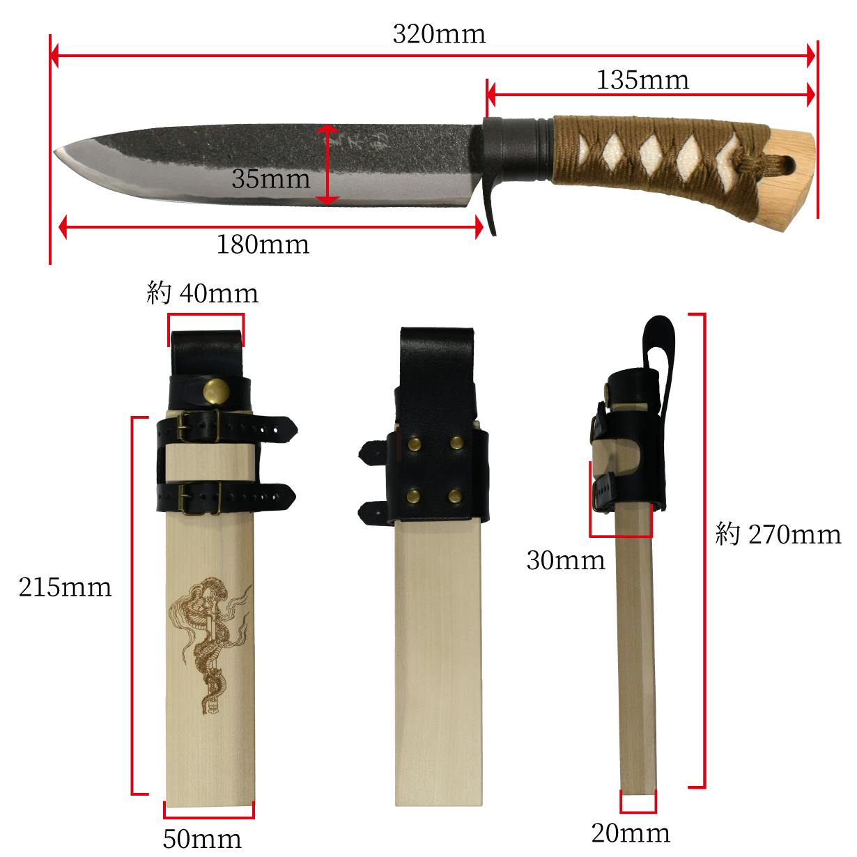 寸法:総寸320mm、ブレード長さ180mm、刃厚6mm、刃幅35mm、ハンドル長さ135mm