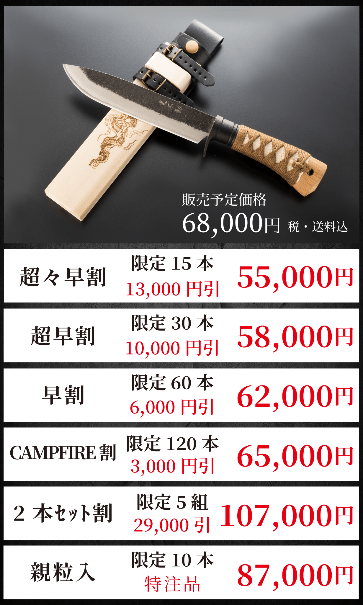 2025/01/18 10:25昨日、最後の3振りが納品され、残りの支援者の方々へ発送させて頂きました。予定より大分遅れてしまい、今まで待っていただいた支援者の方々には大変申し訳ございませんでした。並びに、ここまで待っていただいたことにとても感謝しております。今後も皆様に感動していただける良い商品を開発してゆく所存です。今回のプロジェクトを支援して頂いた皆様には、この場を借り重ねて御礼を申し上げます。ありがとうございました。 もっと見る本日2振り発送いたしました。