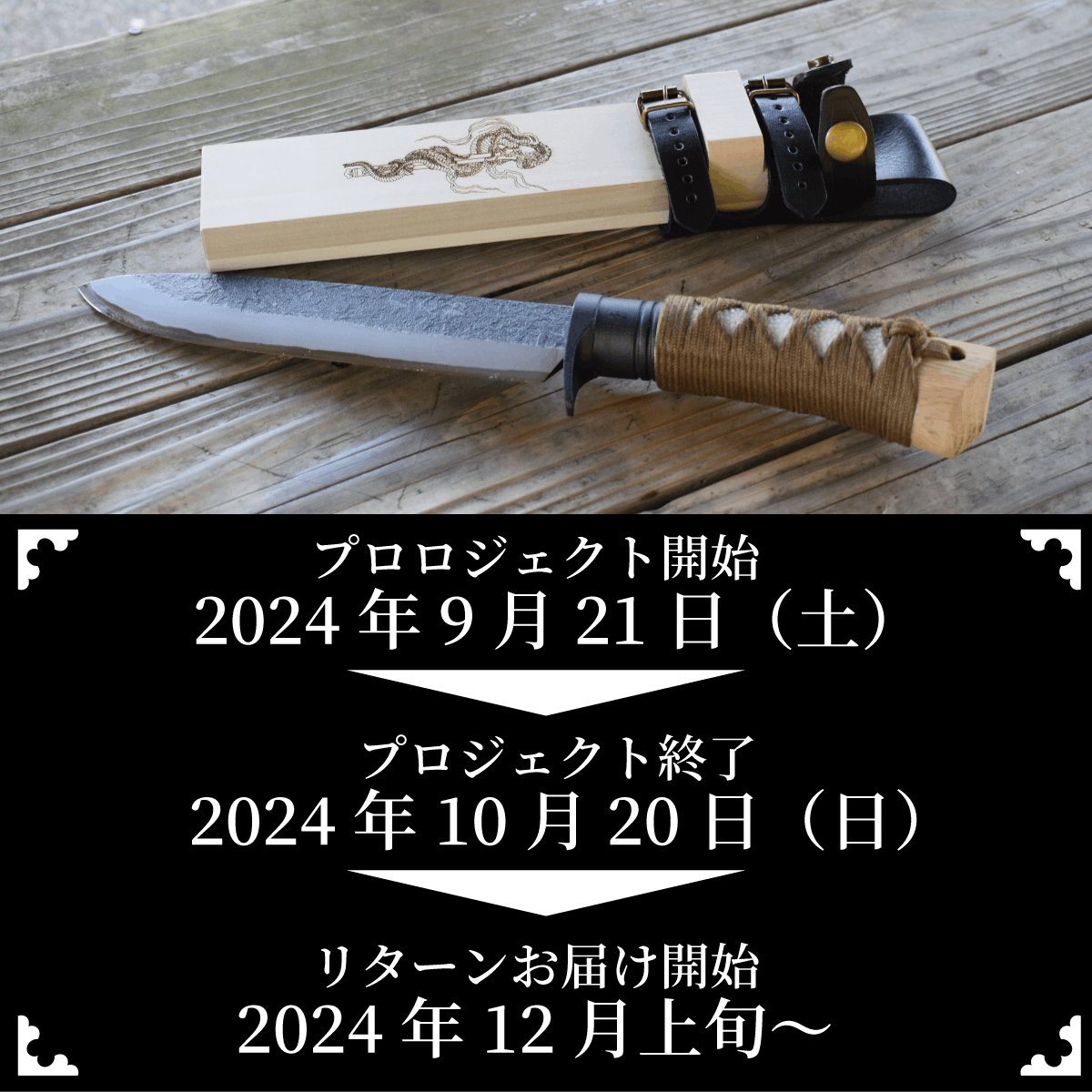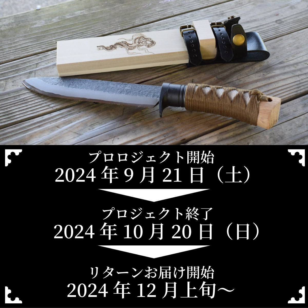 2024/12/28 18:44ご支援いただいた黒不動ですが、年内に全てのリターンを発送できるよう柄巻き師さんに頑張ってもらいましたが、年末の繁忙期ということもあり本年度は本日納品して頂いた2振りまでで、本日発送させて頂きました。大変申し訳ございませんが、残り3振りは年越しとなってしまいた。ご支援いただいたサポーターの皆様には長くお待たせしてしまい、大変心苦しいのですが、重ね重ねお詫び申し上げます。 もっと見る本日4振発送しました。