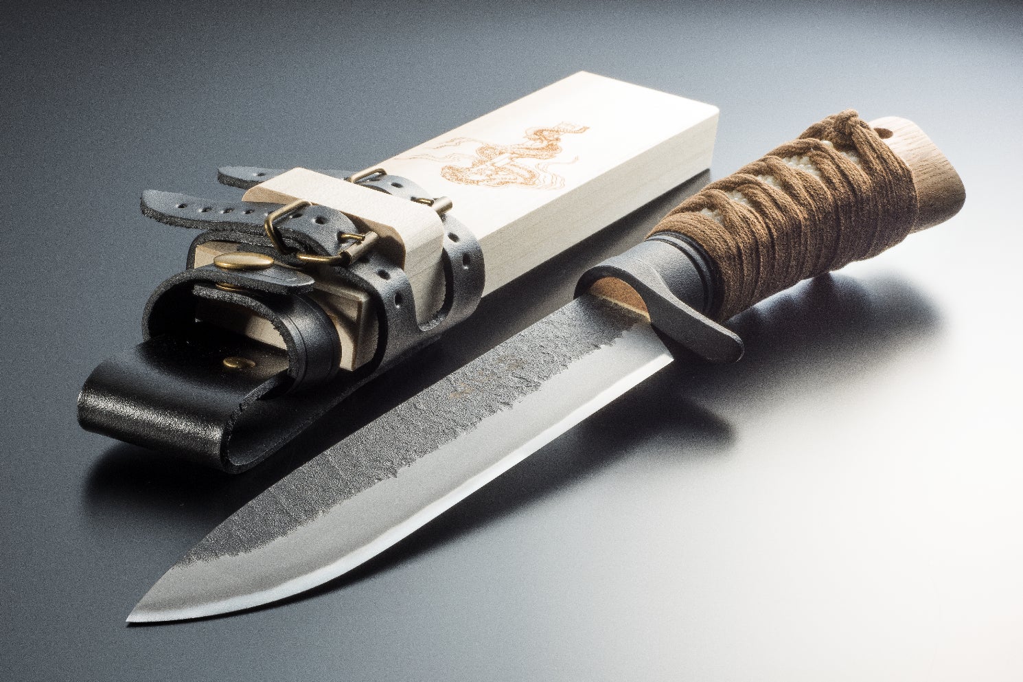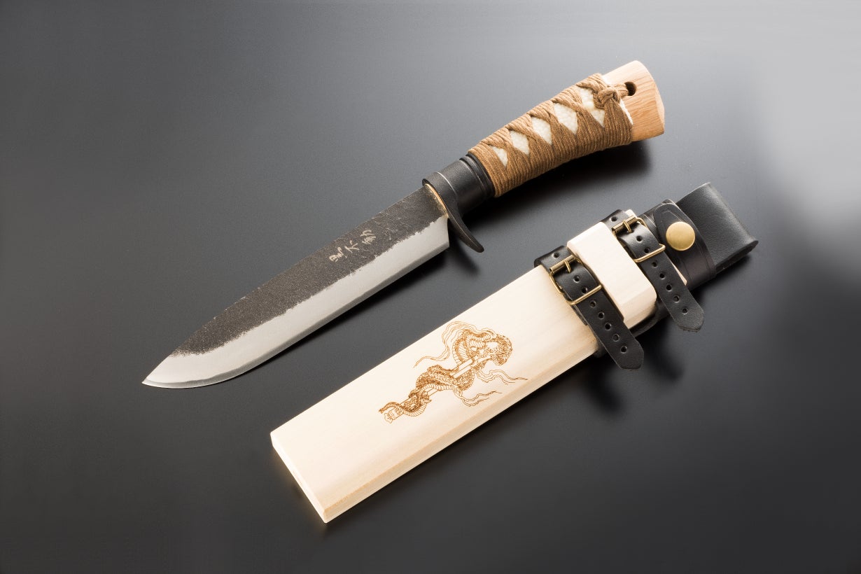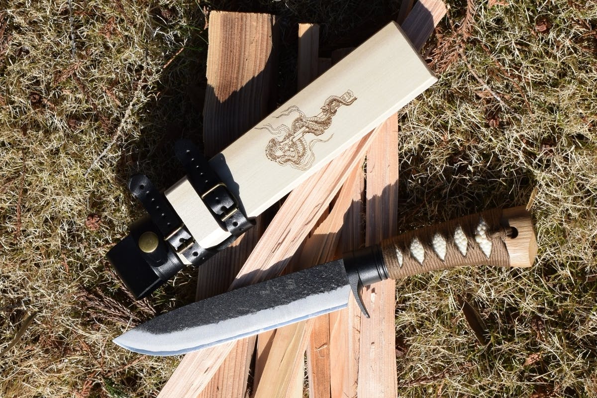 アウトドアでは様々な危険と隣り合わせです。和ナイフ「黒不動」は食材を切って腹を満たし、木を削って道具を作り、焚き付け用に薪を作るなど多用途で使え、サバイバルでもあなたのピンチをサポートします。また木鞘に不動明王の化身の俱利伽羅龍を彫り込み、あなたの安全も祈願しています。