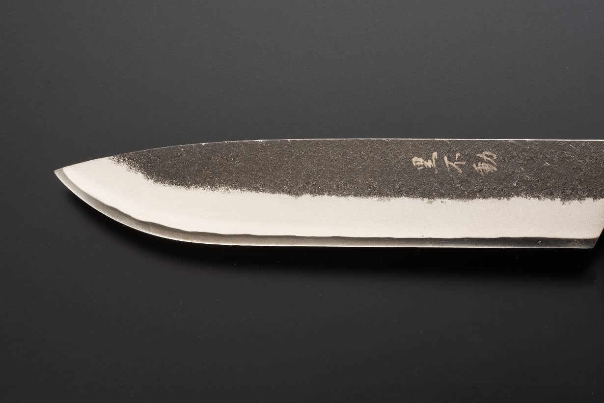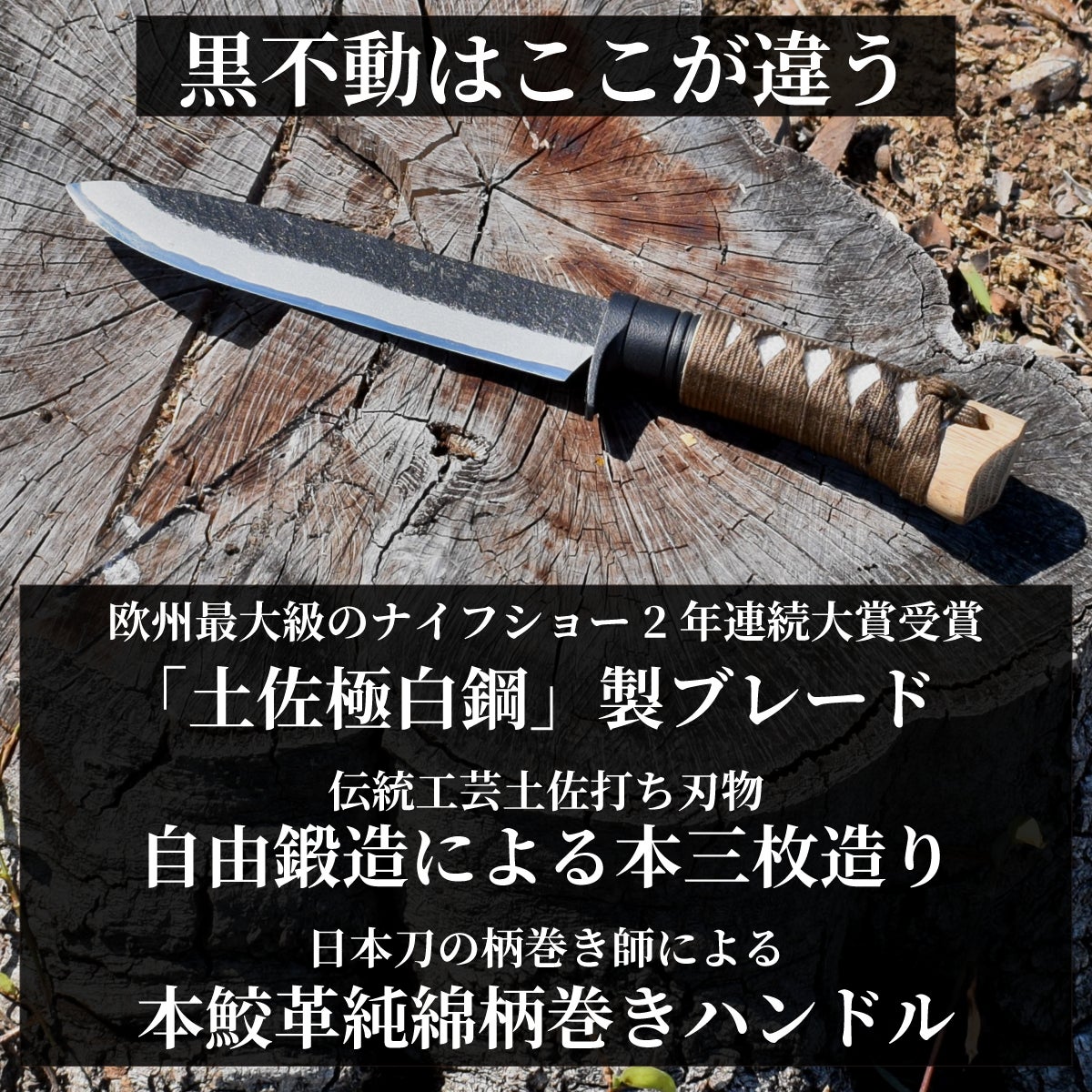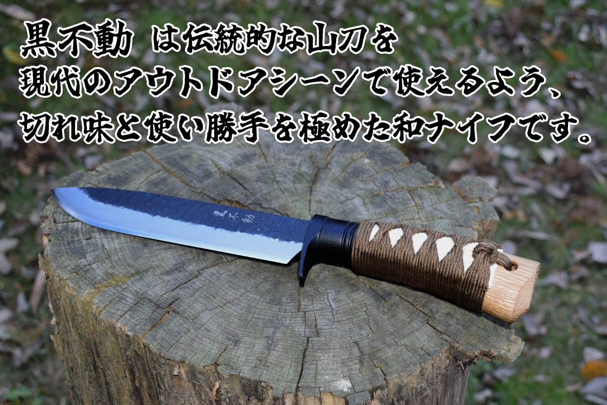 黒不動のブレードにはヨーロッパ最大級のカスタムナイフショー“アウトドアナイフショー”の「切れ味コンテスト」で、2年連続大賞受賞の日本製鋼材「土佐極(とさきわみ)白鋼」を使用しています。
