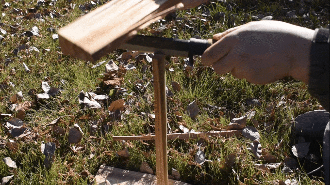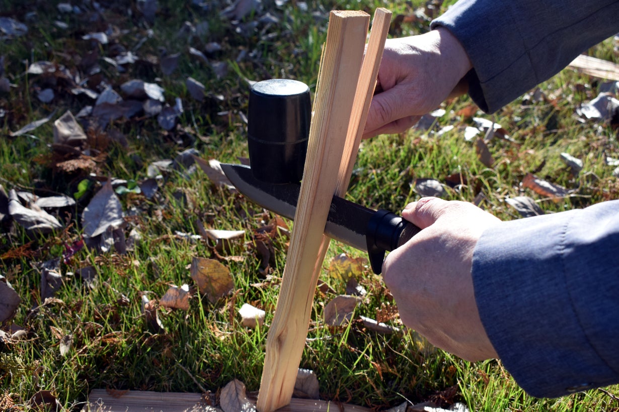 トントンと細かくナイフの背を叩いていくと、ブレードが薪に徐々に入っていきます。この時にブレードが斜めに傾くので、刃が垂直且つブレードは水平にキープしながら叩いてください。