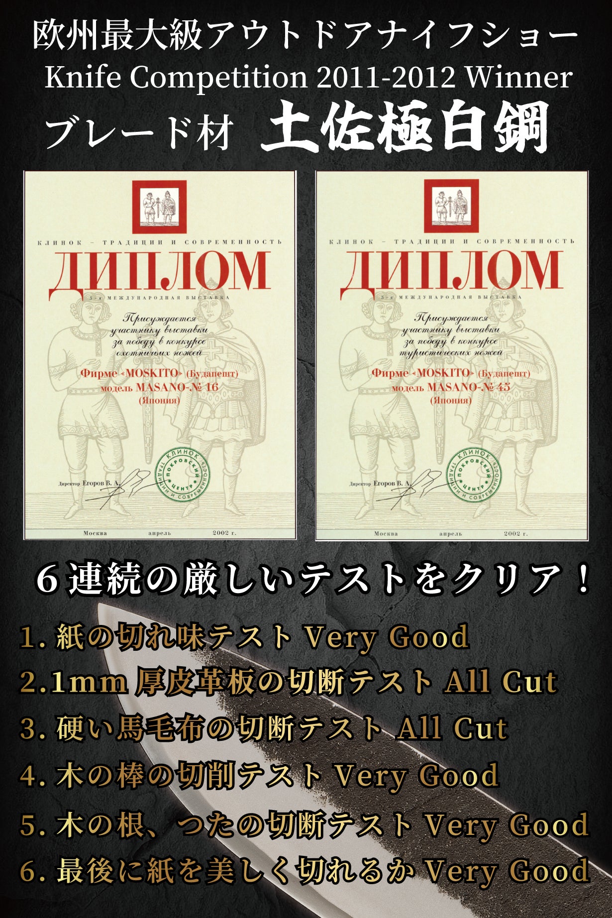参加したナイフのほとんどが2次審査の皮革板切断テストで5~10cm程度しか切り込めなかったのに対し、土佐極白鋼のブレードは皮革板を真っ二つに切断。