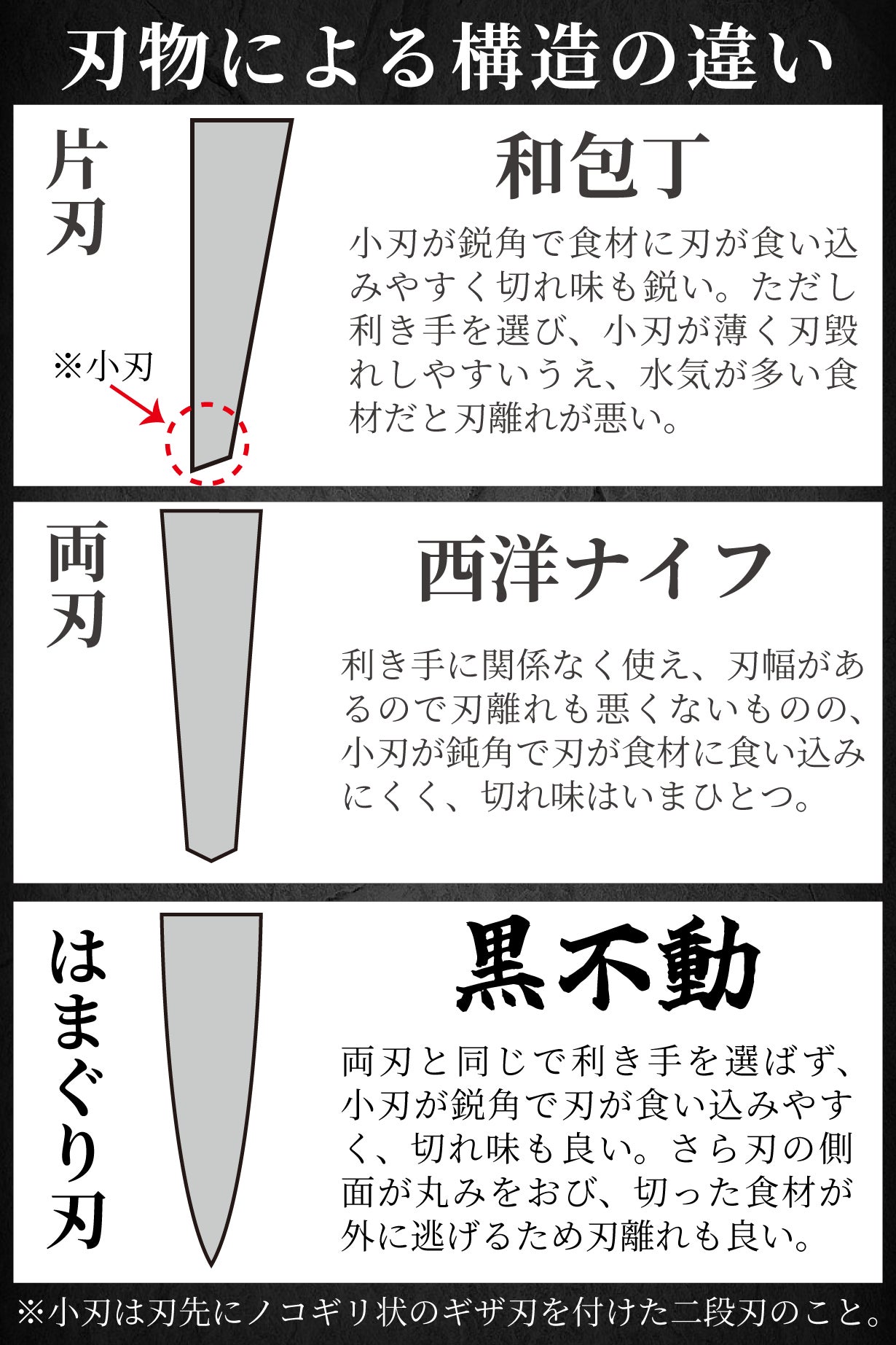 また、刃物の切れ味は刃先にあるノコギリ状の微細な「小刃」が影響しています。どんなに切れ味の持続性を謳うナイフでも、長い間に微細な小刃が押し潰されて摩耗し、いつかは切れ味が鈍ります。切れ味重視でブレードの硬さに偏重したナイフは、その硬さが仇となり研ぎ直しが難しい特性があります。