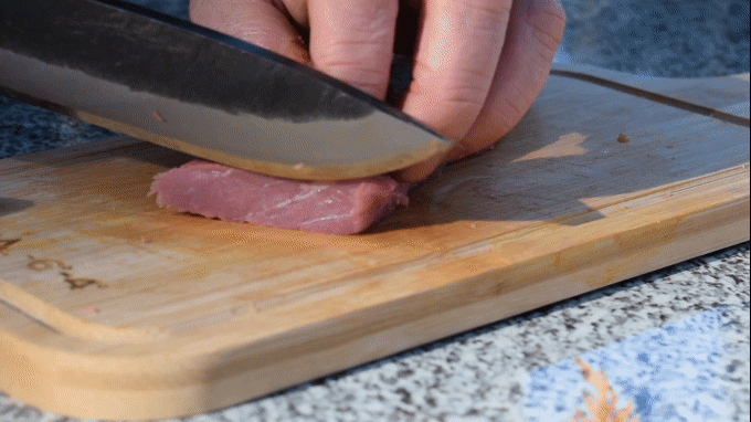 刃厚があっても、刃先は鋭角なので食材に刃がスッと食い込みます。そのため水分や脂が多く刃離れが悪い肉類もスムーズにカットできます。