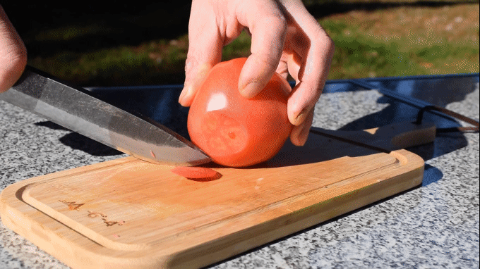 キャンプ飯の準備で潰れやすいトマトも硬いカボチャもこれだけ薄く、サクサク切れます。