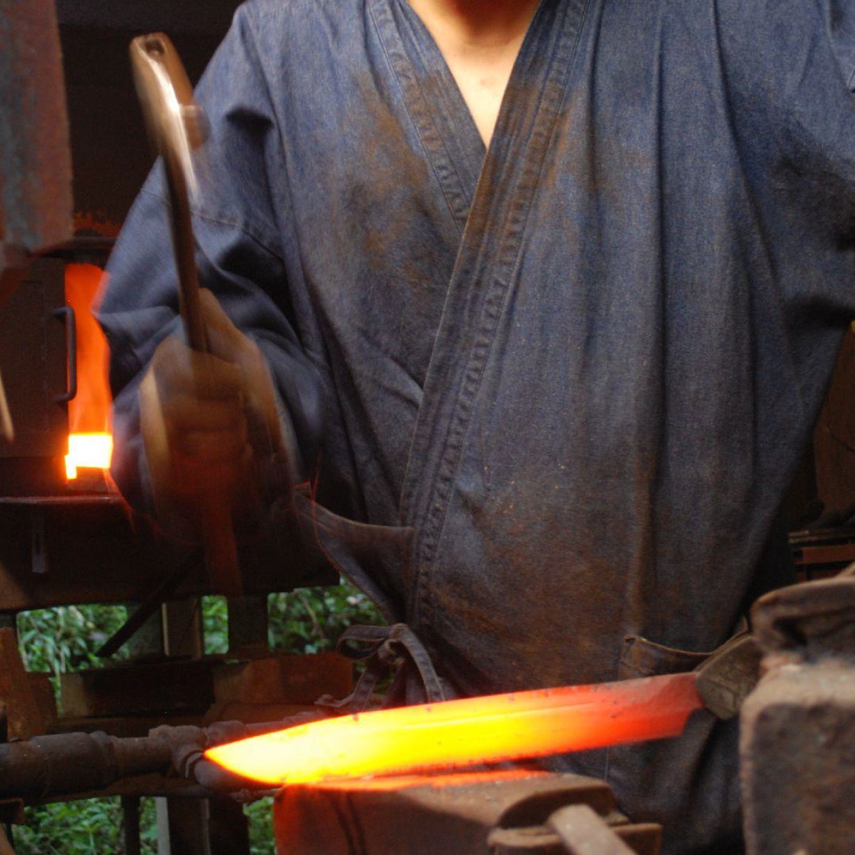 黒不動は土佐打刃物の伝統に則った自由鍛造製。炉で熱した鋼材をハンマーで丹念に鍛え上げています。