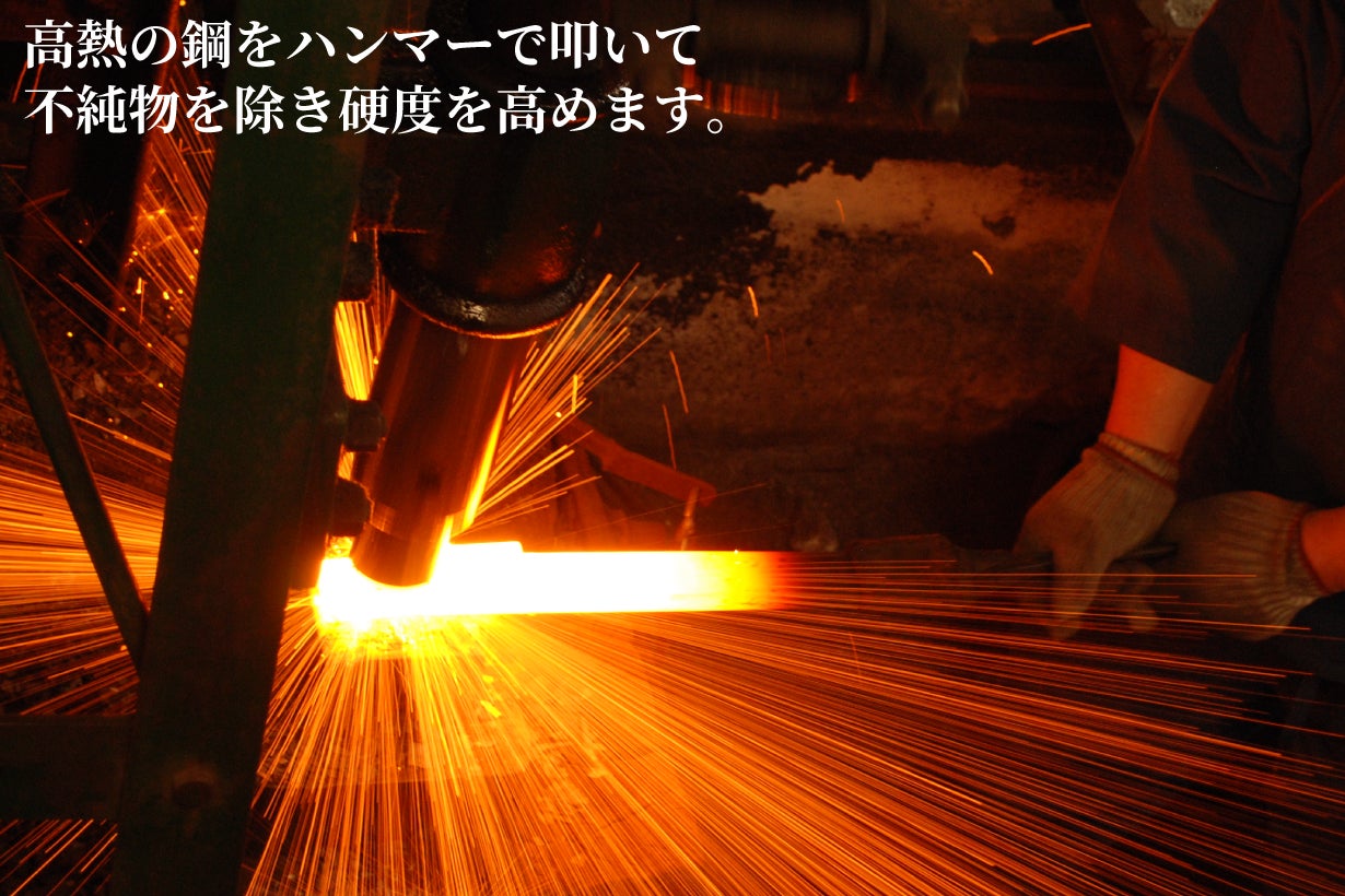 熱した鋼材は叩くと中の気泡や不純物が取り除かれ、純度と密度が増して硬化します。