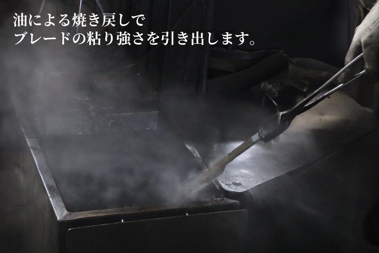 油は水に比べ沸点が高く、焼き戻しの際の冷却速度が遅いため刃物に必要な靭性が増します。そのため「切れ味鋭く耐久性が高い」刃物の製作は、鍛造具合と焼き戻しのタイミングを熟知した熟練職人の経験と勘が必要です。