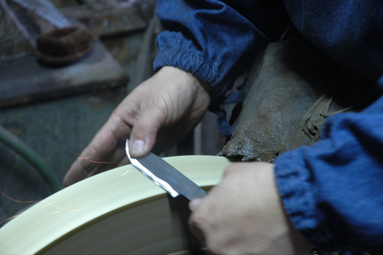 天然素材の鮫皮は1枚1枚厚さや粒の大きさが異なります。柄巻師は個々の鮫皮とハンドルの形状を見極め、柄糸をヘラで微調整しながら、強く、かつ丁寧に巻いて仕上げます。