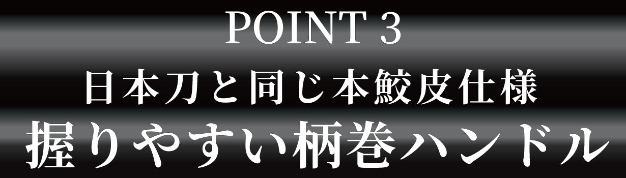 黒不動ではハンドル部分を手のひらのカーブに合わせて形作られているだけではなく、日本刀の『刀装技能者展覧会』で銀賞受賞した正真正銘の日本刀の柄巻師(つかまきし)さんに、日本刀の柄と同様に本鮫皮※に純綿柄糸(つかいと)で柄巻をして頂きました(日本刀剣界の慣例で名前は伏せて頂きます。)。