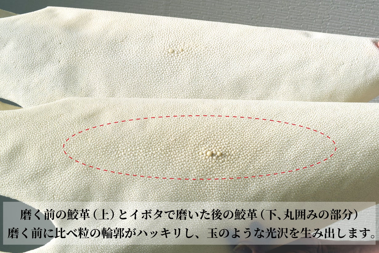 なぜなら鮫革の表面の細かな粒は歯と同じリン酸カルシウムの結晶で、刃物を当てても簡単には傷つきません。