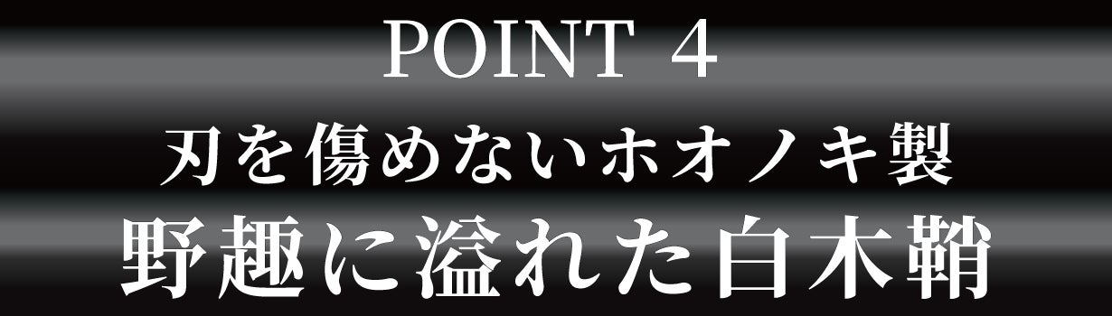 朴は木材として狂いが少なく、手触り良く、ヤニが少ないのに水に強く、乾燥も比較的早いという特徴があります。また適度に柔らかいため出し入れで刃を傷つけず、古くから日本刀の鞘は基本的に朴を用います。