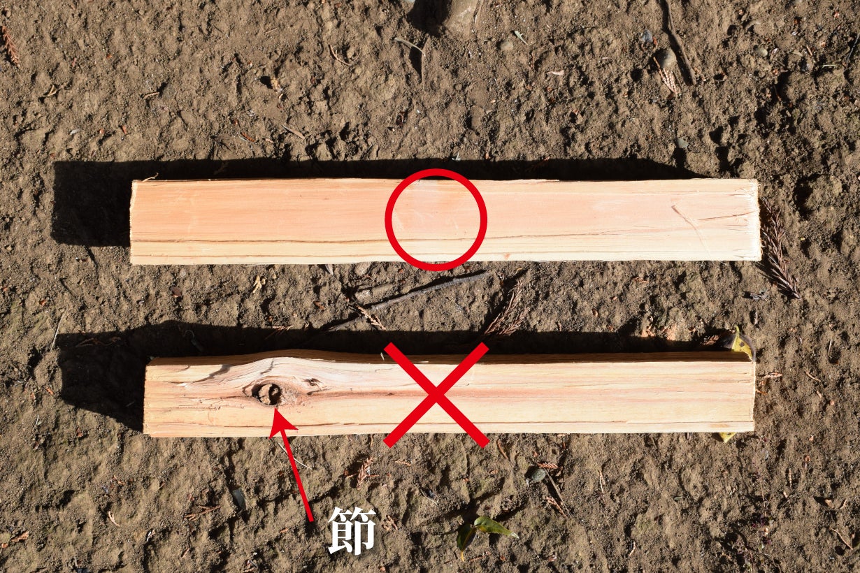 - ① バトニングをする前に、薪に節があるか確認します。節は非常に堅いため、節がある場所は避けます。
