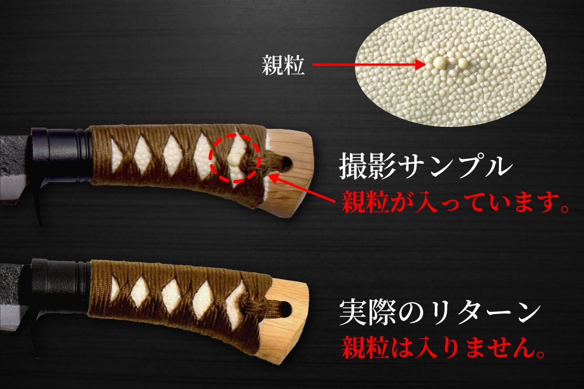 ただし、日本刀の拵(こしらえ)の柄巻では、この装飾の一部として親粒を中心に使用します。どうしてもサンプルと同じ「親粒」入りのハンドルが欲しい方のために、リターンで特注品もご用意しました。通常では手に入り難い仕様ですので、ぜひこの機会にお求めください。