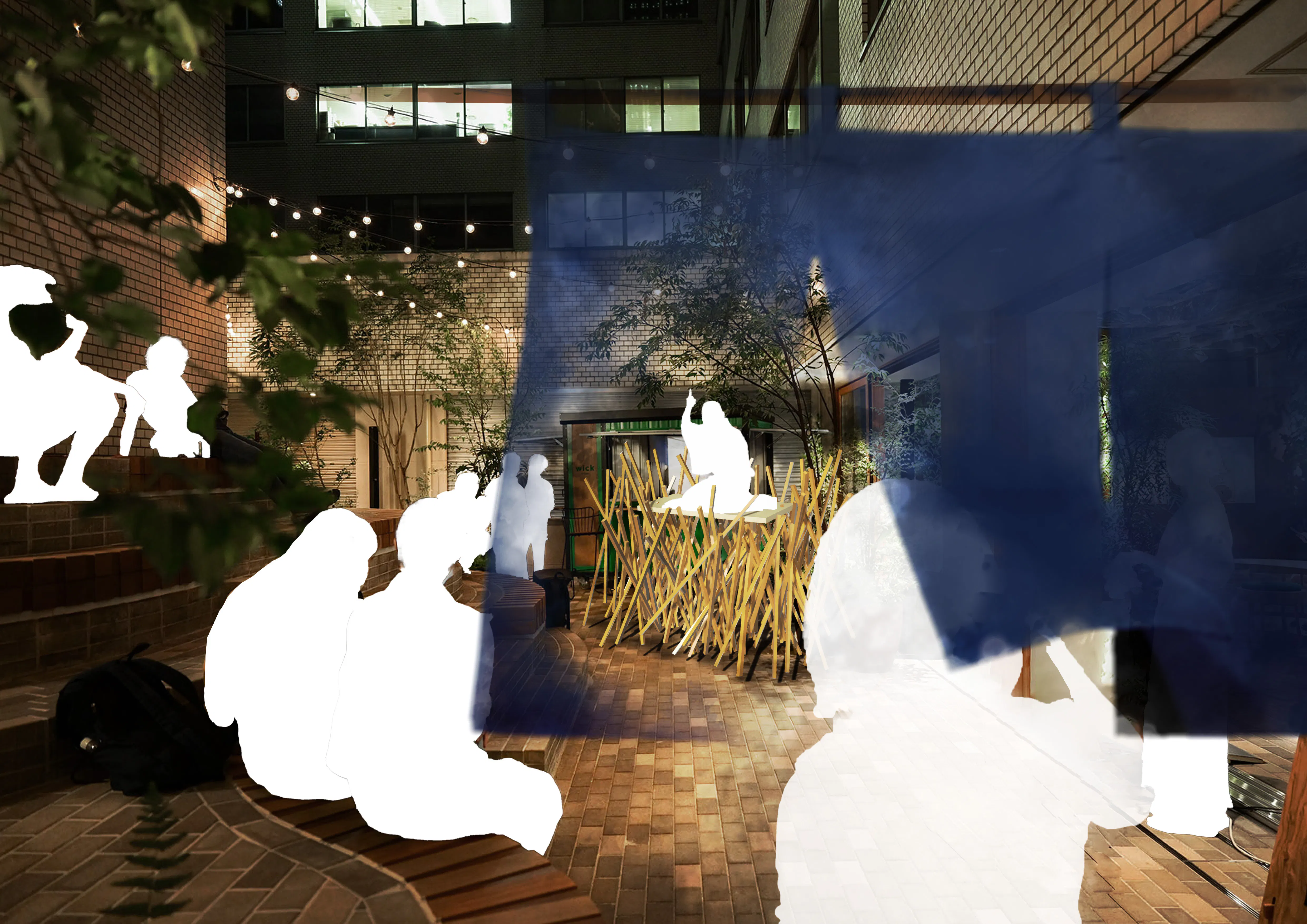 空間に挿入することで、高層ビル群の一角に一夜限りの「おちば」を生み出しました。