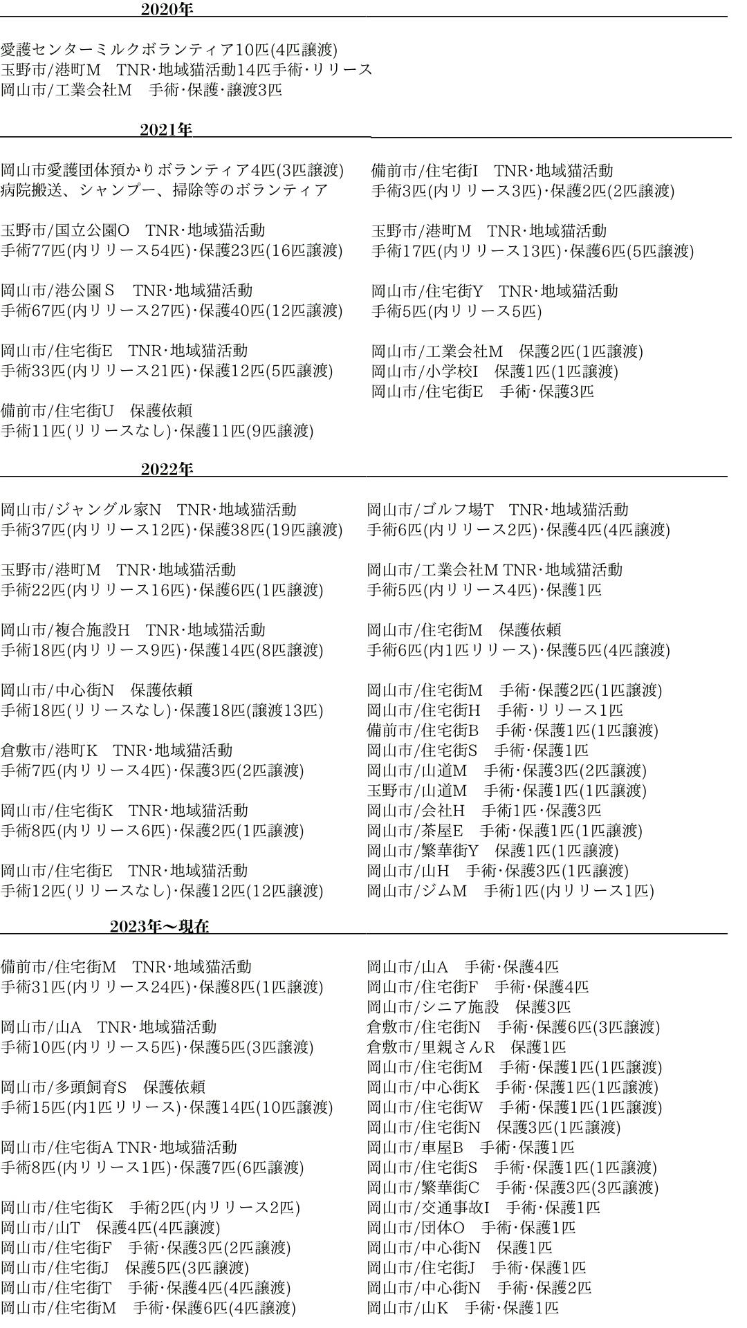 ◉これまで4年間の活動で、465匹の不妊手術、316匹の保護、177匹の譲渡ができました。