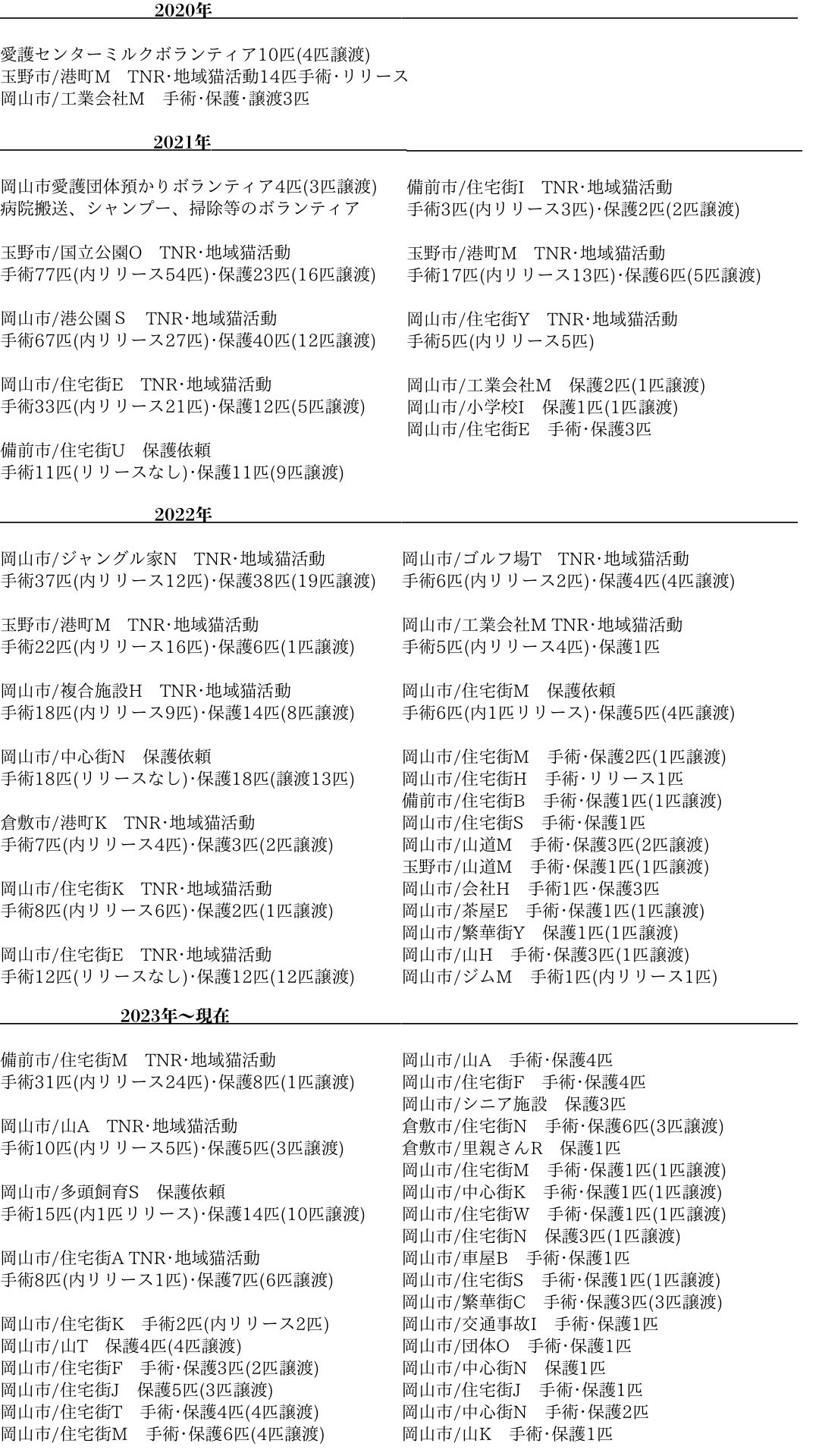 ◉これまで4年間の活動で、465匹の不妊手術、316匹の保護、177匹の譲渡ができました。